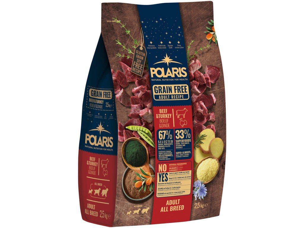 POLARIS jsou superprémiové receptury granulí pro psy, bez obilovin, s čerstvým masem a mnoha blahodárnými přírodními ingrediencemi pro podporu zdraví a vitality vašich mazlíčků. ActiveMOS (zdroj mannan-oligosacharidů), kořen čekanky (zdroj inulinu) a vláknina z psyllia, fungují jako prebiotika a pomáhají tak podporovat zdravé trávení a vyváženou střevní mikroflóru. Pro posílení imunitního systému je v granulích obsažen Macrogard (zdroj beta glukanů) spolu s přírodními zdroji antioxidantů jako spirulina, rakytník a bylinky (rozmarýn, tymián a petržel). Zdravou kůži a lesklou srst podporují omega nenasycené mastné kyseliny, které v optimálním poměru podporují zachování přirozené struktury a funkce kůže. Chondroitin a glukosamin pomáhají udržovat zdravé a flexibilní klouby a chrupavky. Taurin přispívá k dobrému zraku a k silnému a zdravému srdci.