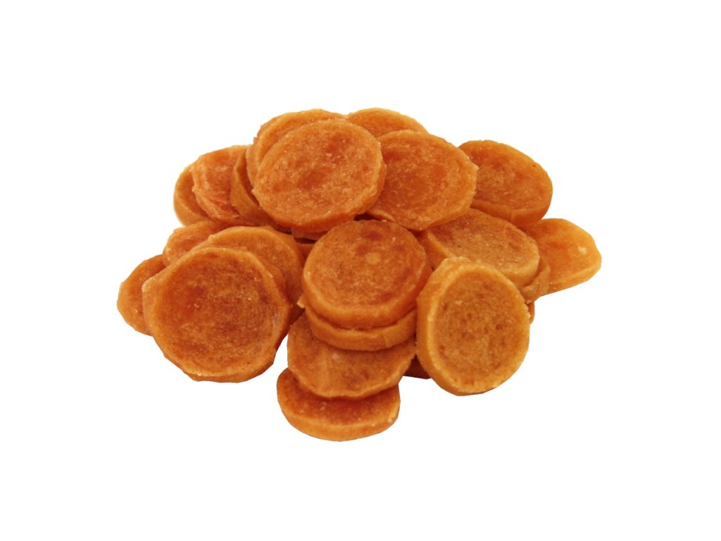 Kuřecí maso obsahuje minimum tuků, a tak jsou tyto kuřecí chipsy vhodné i pro pejsky, kteří musí dodržovat dietu. Šetrná technologie zpracování uchovává přirozené výživné látky.