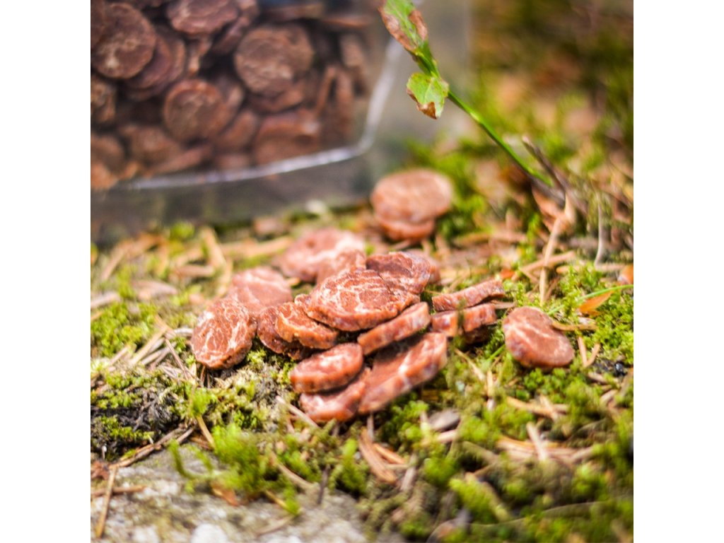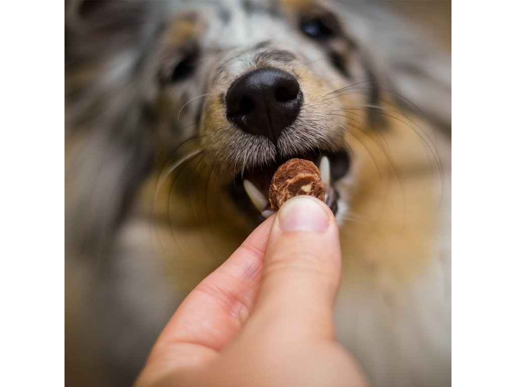 Ideální tréninkový pamlsek by měl být malý, abyste si ho před tréninkem nemuseli stříhat či krájet. No a ideálně aby pamlsek nedrobil, ať nemáte špinavé kapsy. V neposlední řadě by mohl mít nějakou přidanou hodnotu, když už s ním budete pejska při výcviku prokrmovat, že jo? Jehněčí lupínky s treskou jsou lehce stravitelné a hypoalergenní. Obsahují cenné vitamíny skupiny B, především vitamín B12, který podporuje tvorbu červených krvinek a je důležitý pro správný metabolismus a nervový systém. Omega-3 podporuje krásnou a zdravou srst. Malé kousky pejsek rychle sní, nezdržuje se tak dlouhým žvýkáním. Maso je pro psa přirozeně velmi lákavé, voňavé a chutné. Masové tréninkové pamlsky jsou ideální motivací a odměnou.