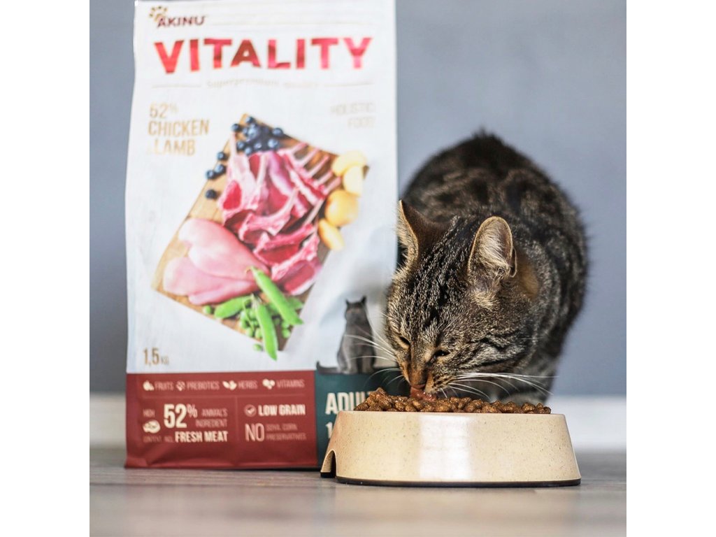 Přes den o něm člověk neví, běhá po lese a prozkoumává krásy přírody. Večer se však pravidelně vrací domů. Očekává plnou misku kvalitních granulí. Po vydatné večeři se k vám spokojené přitulí, přede a užívá si vaší společnost. V Akinu VITALITY pro dospělé kočky najde vše, co pro spokojený kočičí život potřebuje. Kuřecí maso je lehce stravitelné a bohaté na vitaminy a minerály. Jehněčí maso je hypoalergenní, bohaté na vitaminy skupiny B.