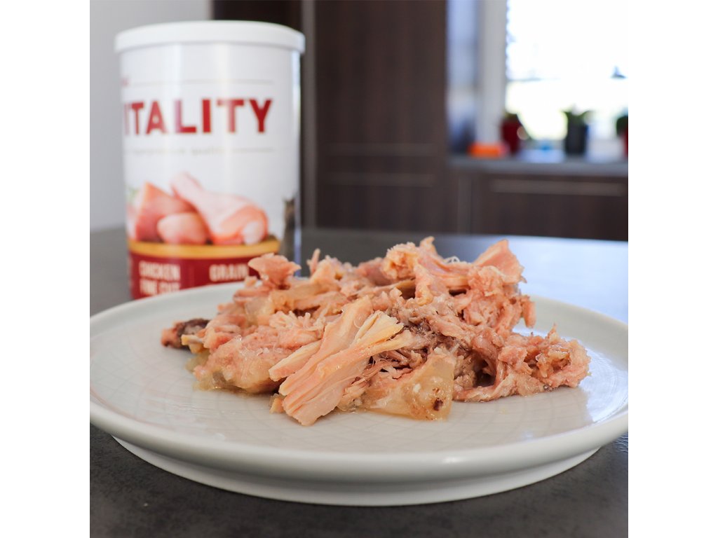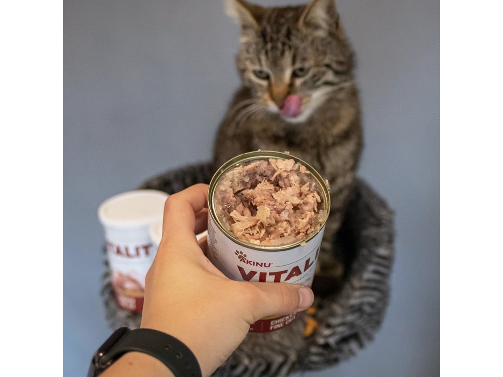 Akinu VITALITY Kuře jemně krájené pro kočky 400g. Maso uvnitř je naporcováno. Konzerva je tak připravena ke krmení. Neobsahuje sóju, dochucovadla, konzervační ani barvící látky. Vyrobeno v České republice. V konzervě mohou být kosti, které jsou z mladých kuřat, kde ještě neproběhla osifikace, a tak jsou kosti měkké, neštěpí se a kočce nemohou ublížit.