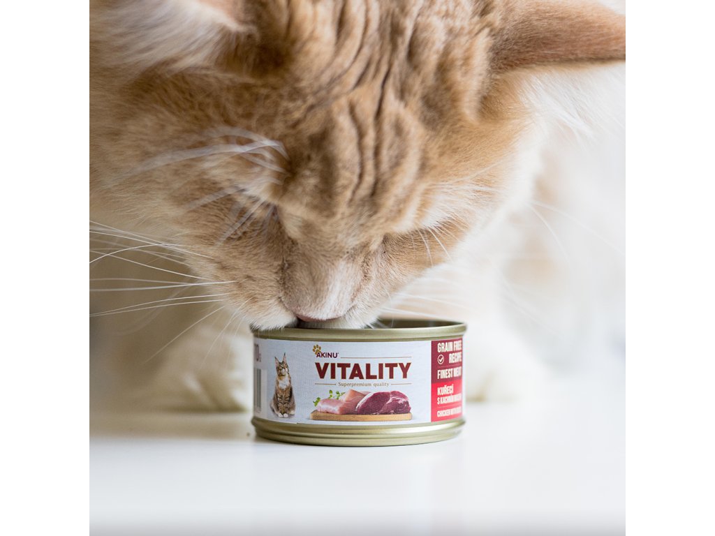 Hledáte pro svou kočičku kvalitní, zdravou a chutnou konzervu? Chcete jí dopřát jen to nejlepší a užívat si její spokojené vrnění? Kuřecí konzerva Akinu VITALITY s kachním masem neobsahuje konzervanty, barviva ani obilí, zato je plná vitamínů a pro vaši kočku prospěšných látek. A jak skvěle chutná!