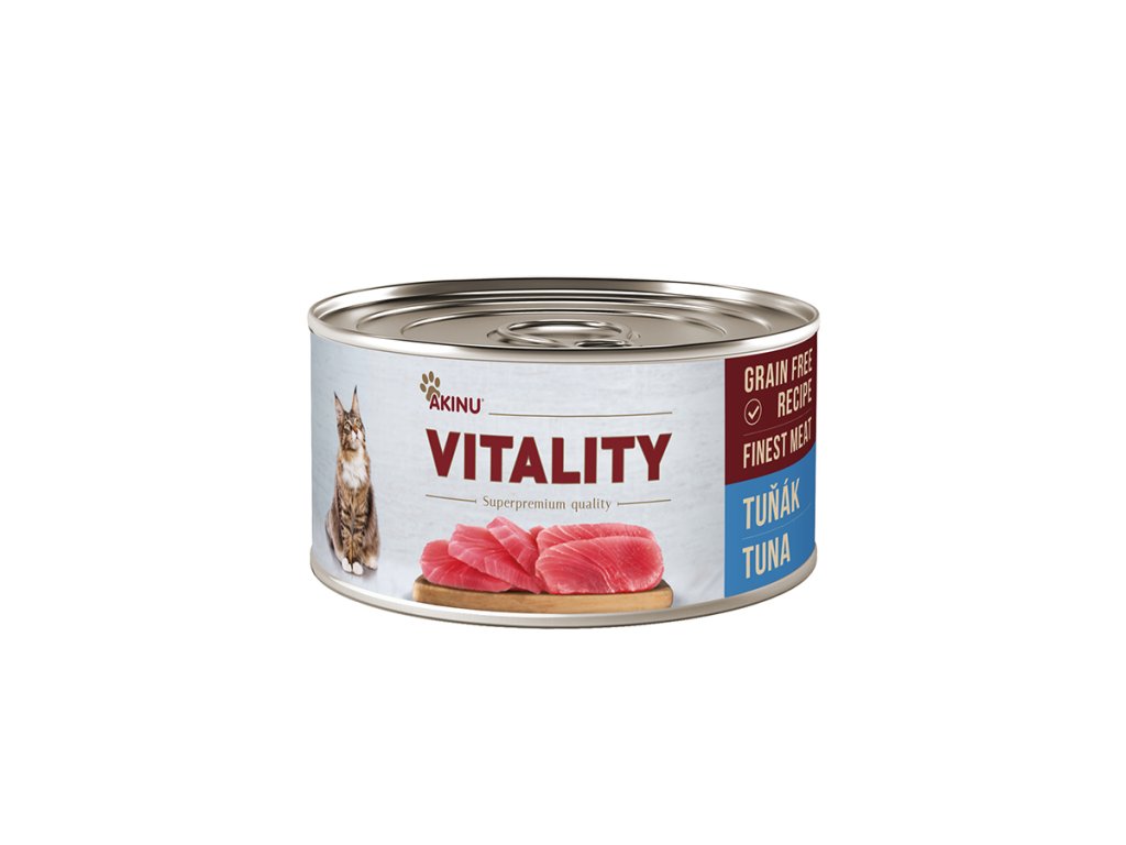 Akinu VITALITY tuňák. Tuňák má vysoký obsah bílkovin a nízký obsah uhlohydrátů. Tuňák také obsahuje Omega-3 esenciální mastné kyseliny EPA a DHA, které přispívají k celkovému zdraví pokožky a srsti a mohou také pomáhat zlepšovat zánětlivé stavy, jako jsou alergie, artritida, zánětlivá onemocnění střev a kožní onemocnění.
