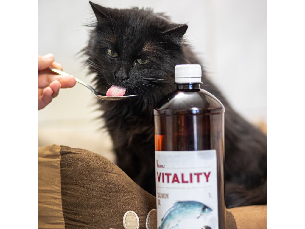 VITALITY LOSOSOVÝ OLEJ je extra čistý, za studena lisovaný a bezvodý. Netuhne v chladu (až do - 10 ⁰C) a neobsahuje příměsi jiných druhů olejů. Má vynikající účinek na kvalitu a lesk srsti a zlepšuje fungování metabolismu. Je přirozeným zdrojem energie a také jedinečným zdrojem nenasycených mastných kyselin Omega 3, DHA (kyselina dokosahexaenová) a EPA (kyselina eikosapentaenová). Je vhodný jako přísada a ochucovadlo pro zalití těstovin, nízkotučných granulí, libového masa či zeleniny. 100 g lososového oleje představuje 3,4 MJ = 812,6 kcal. (Pro srovnání: 100 g hovězího masa představuje 0,49 MJ = 117,1 kcal)