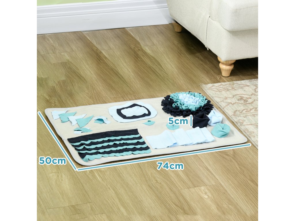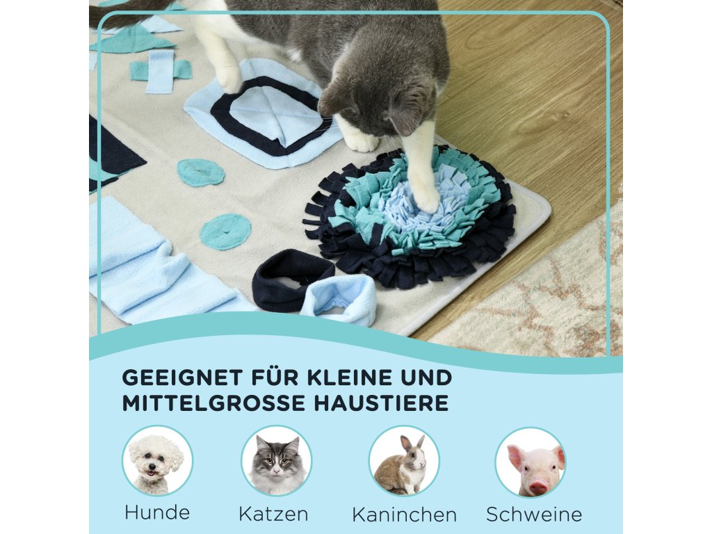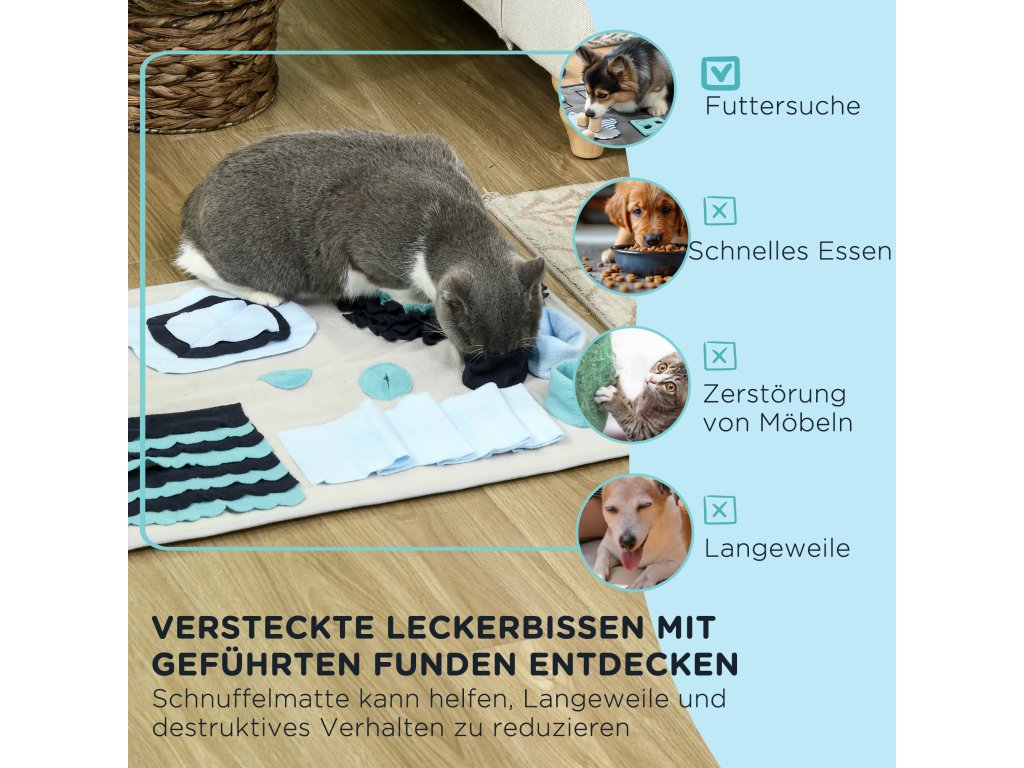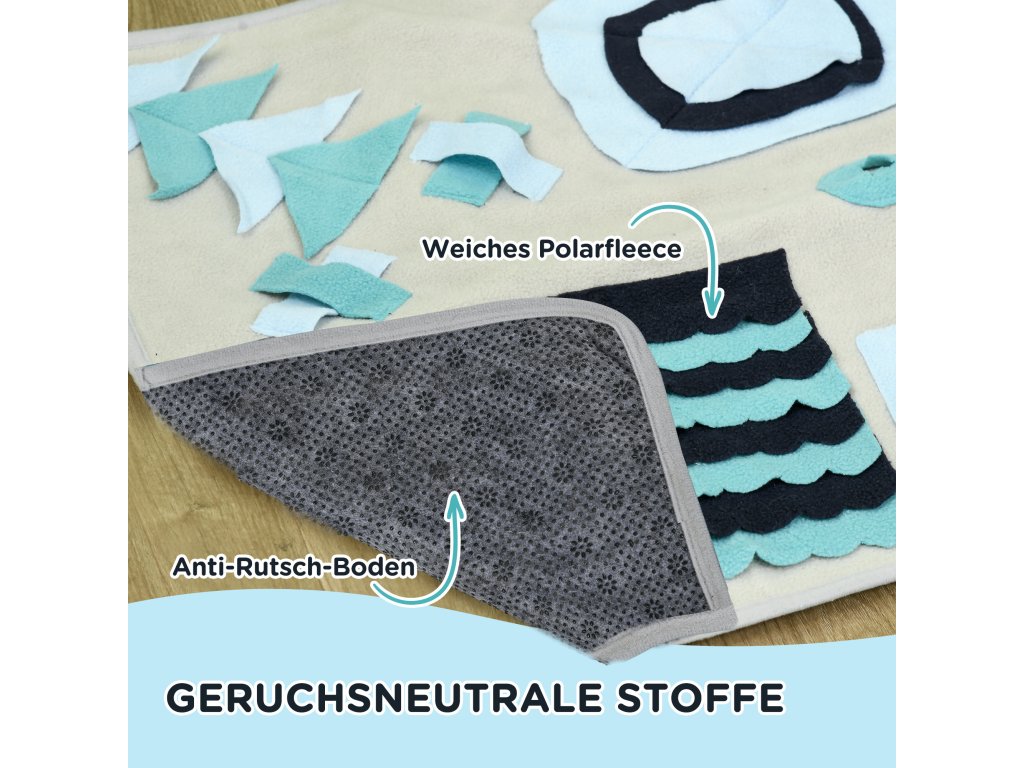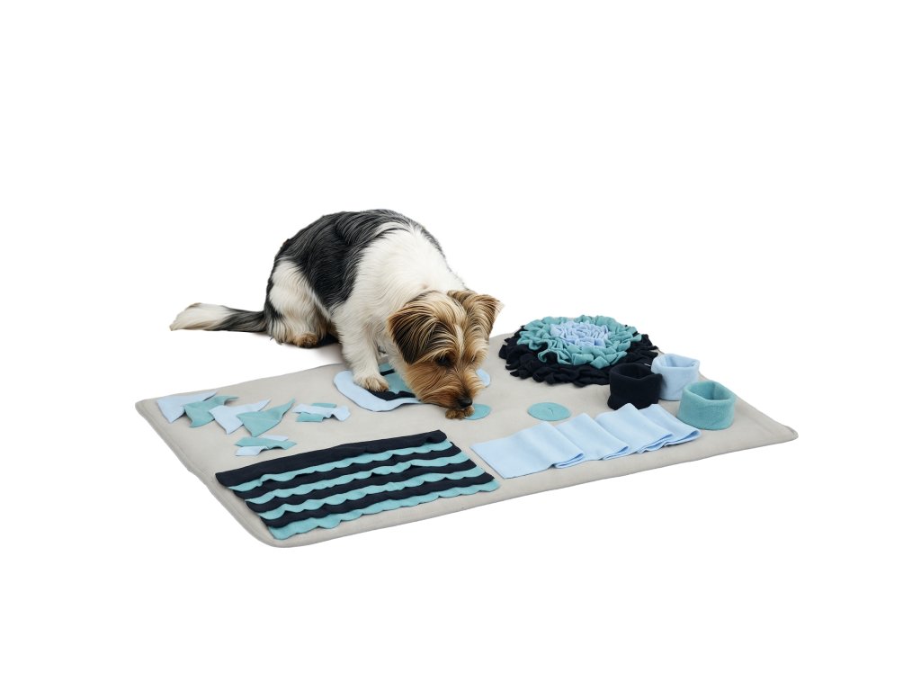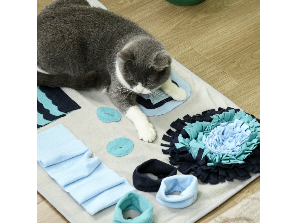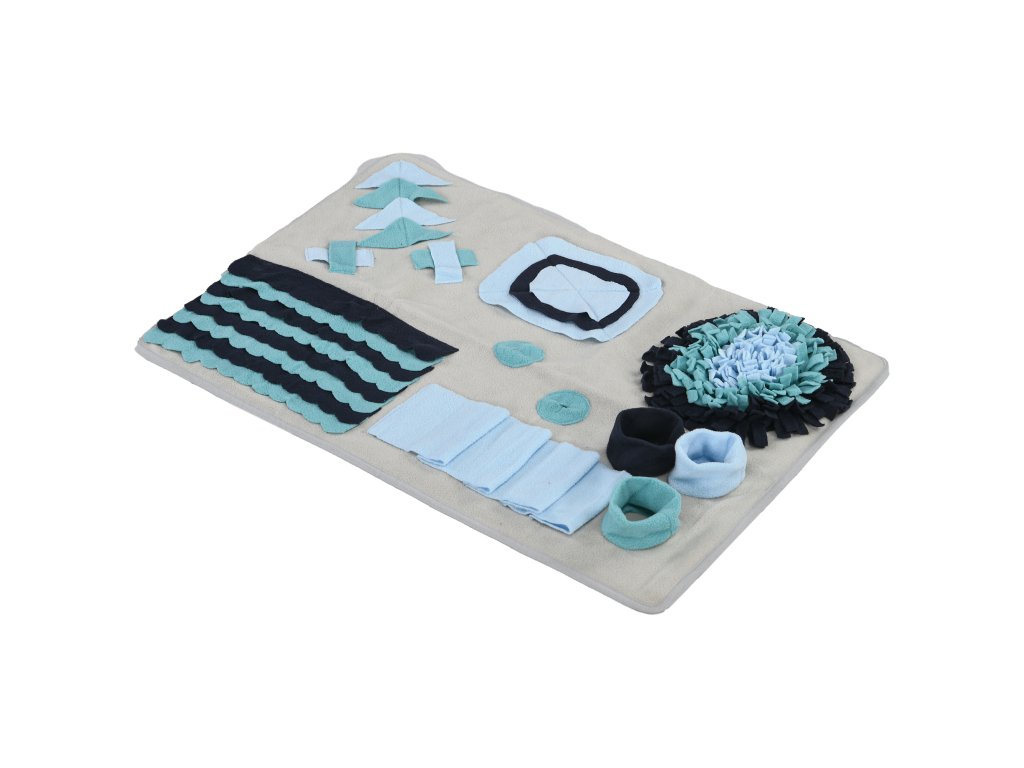 Čmuchací deka je praktická pomůcka i hračka, která podporuje pomalé krmení a zdravější trávení domácích mazlíčků. Granule nebo pamlsky se ukryjí do různých záhybů, kapes a otvorů na podložce a zvíře je musí vyčmuchat a postupně vytahovat. Díky tomu jí pomaleji, nehrozí hltání, nadýmání ani přejídání a zároveň se posiluje jeho přirozený čichový instinkt. Podložka je vyrobena z kvalitního polyesteru, má měkký povrch šetrný k tlapkám i čumáku a spodní část s protiskluzovou úpravou, která brání posouvání při používání.