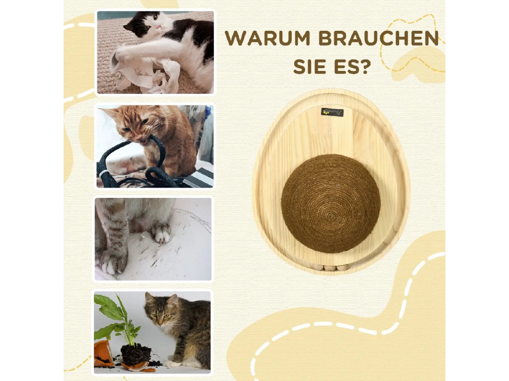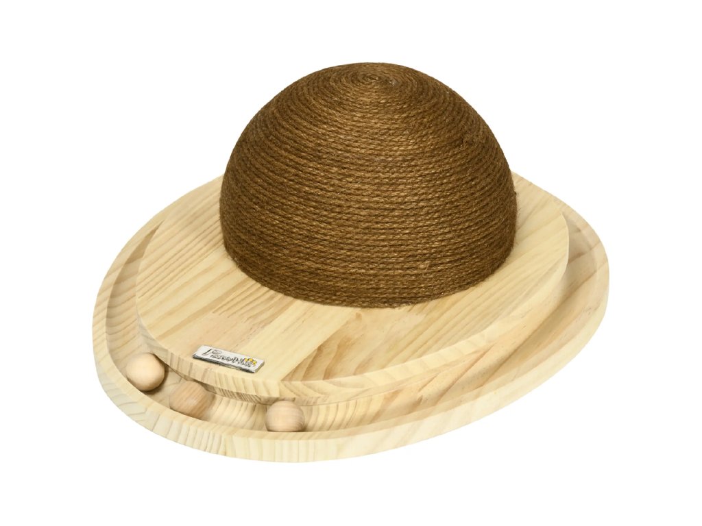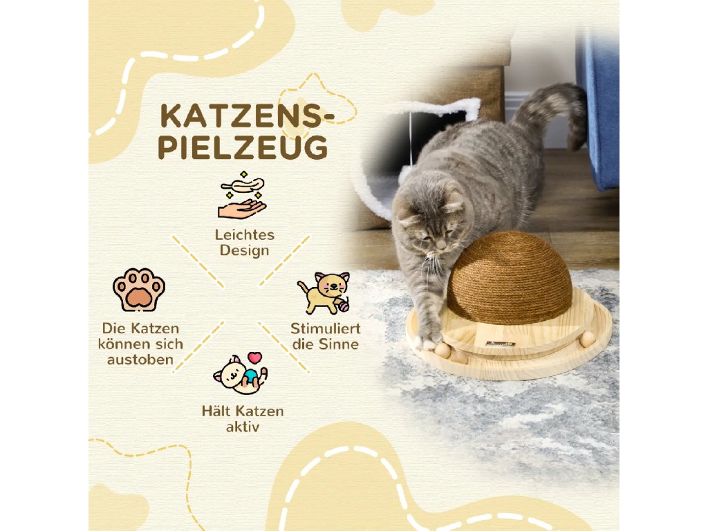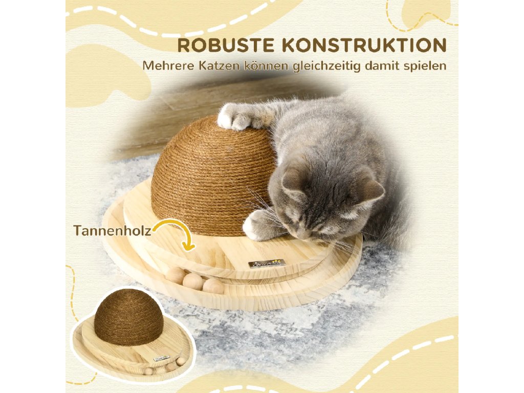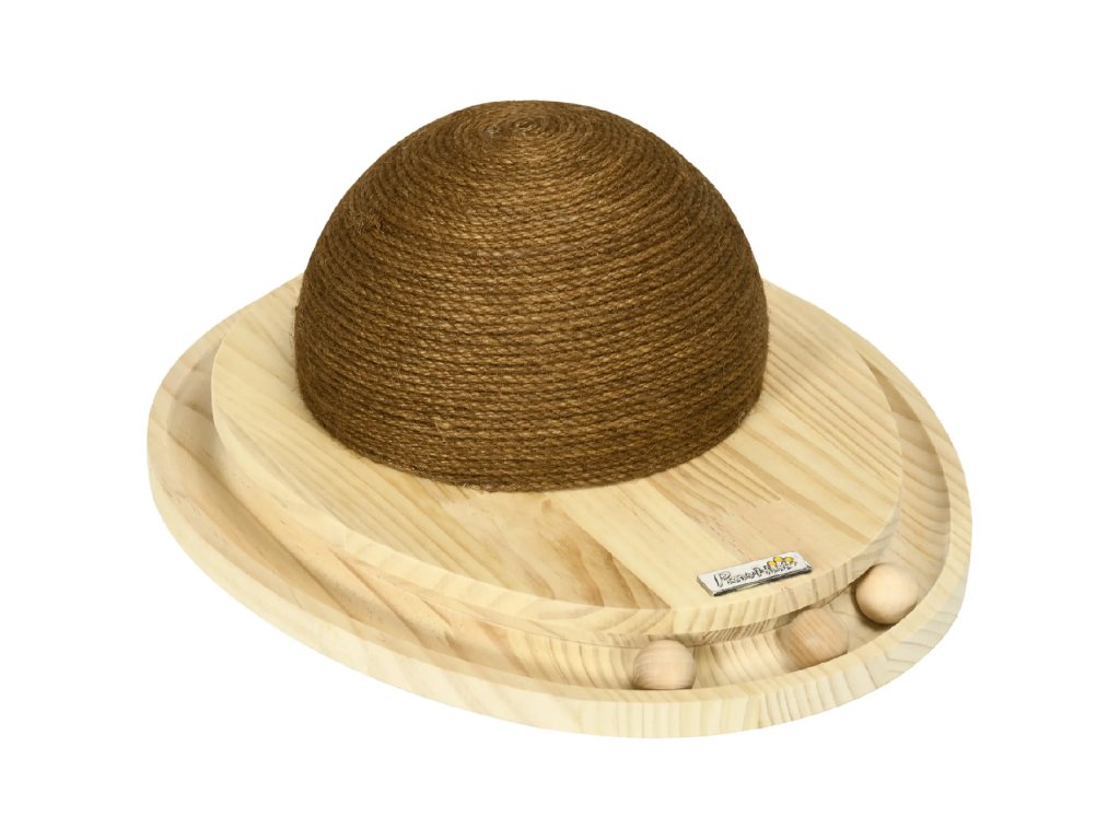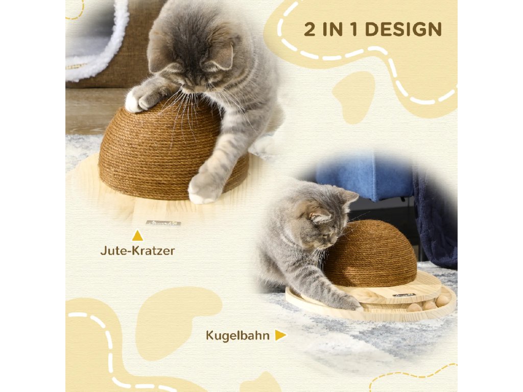 - Hračka 2v1 spojující dvě funkce do jednoho produktu: jutová škrabací plocha a dráha s dřevěnými míčky.