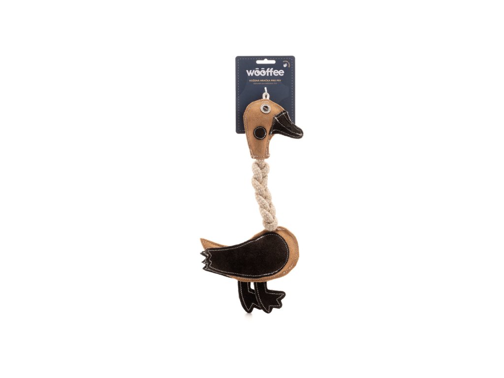 Wooffee kožená hračka Kachna s provazem je ideální volbou pro psy, kteří milují žvýkání, přetahování a aportování. Vyrobená z pravé buvolí kůže a kokosových vláken, nabízí nejen odolnost, ale i přirozenou vůni, která probouzí lovecké instinkty. Díky jutovému provazu s bavlnou je hračka šetrná k zubům a vhodná i pro štěňata v období přezubování.