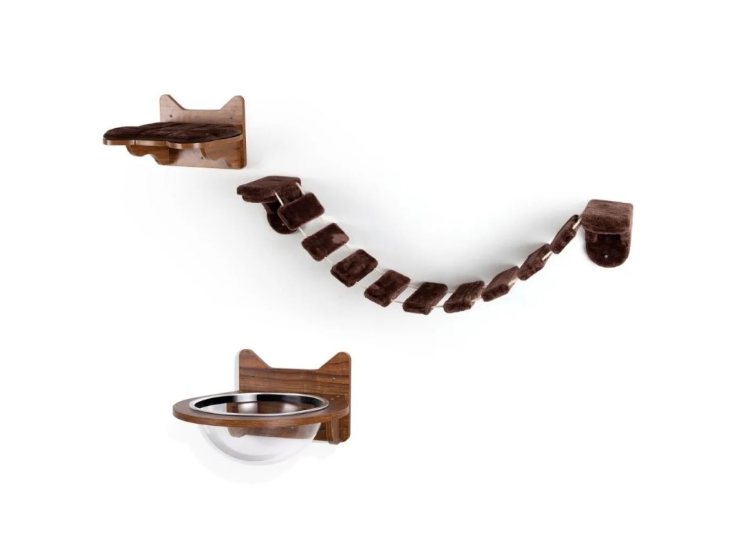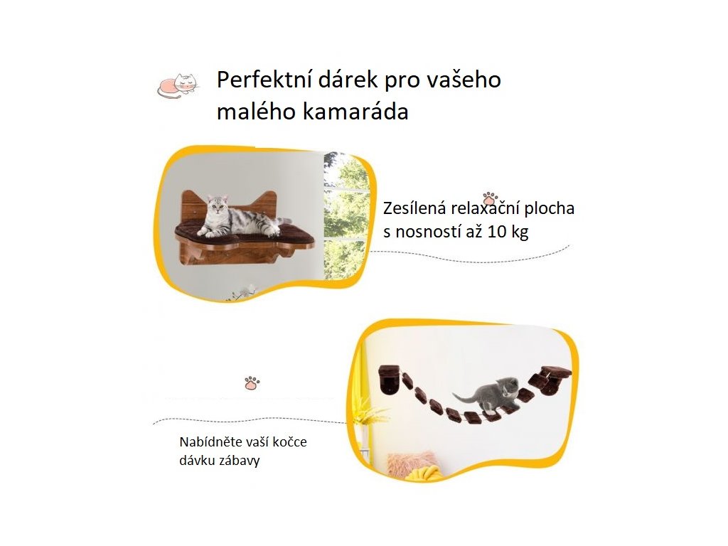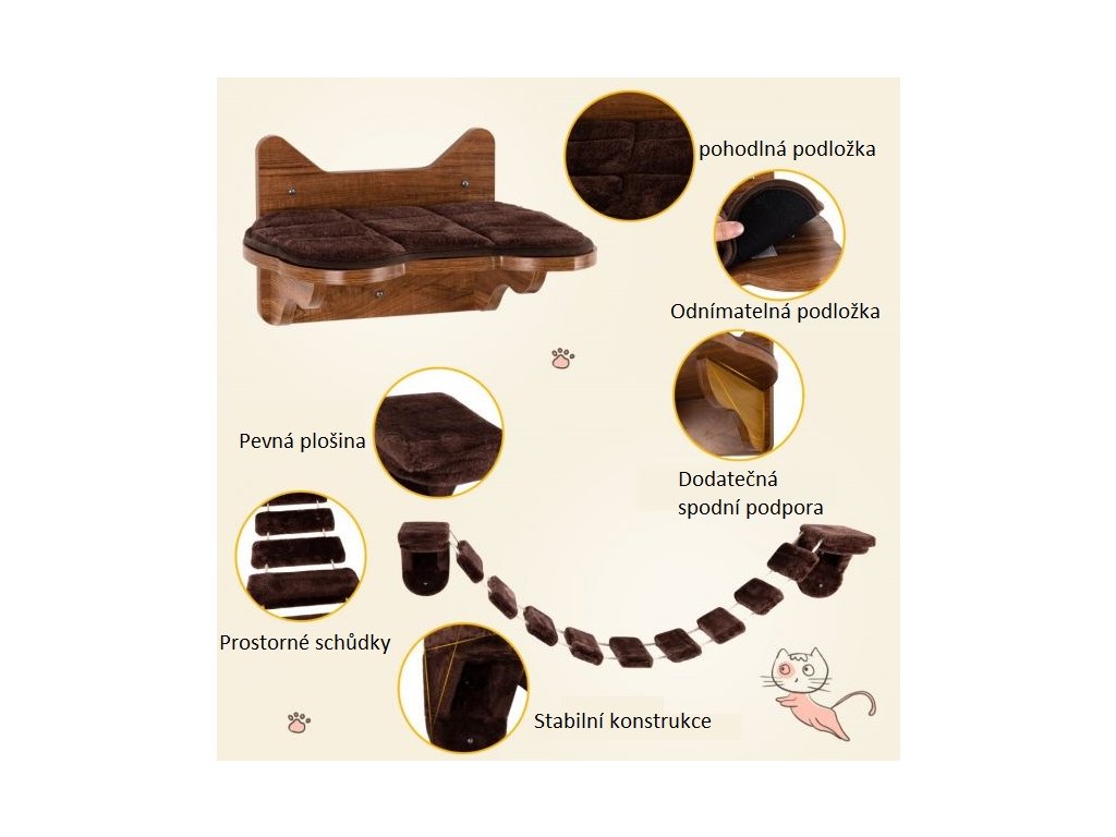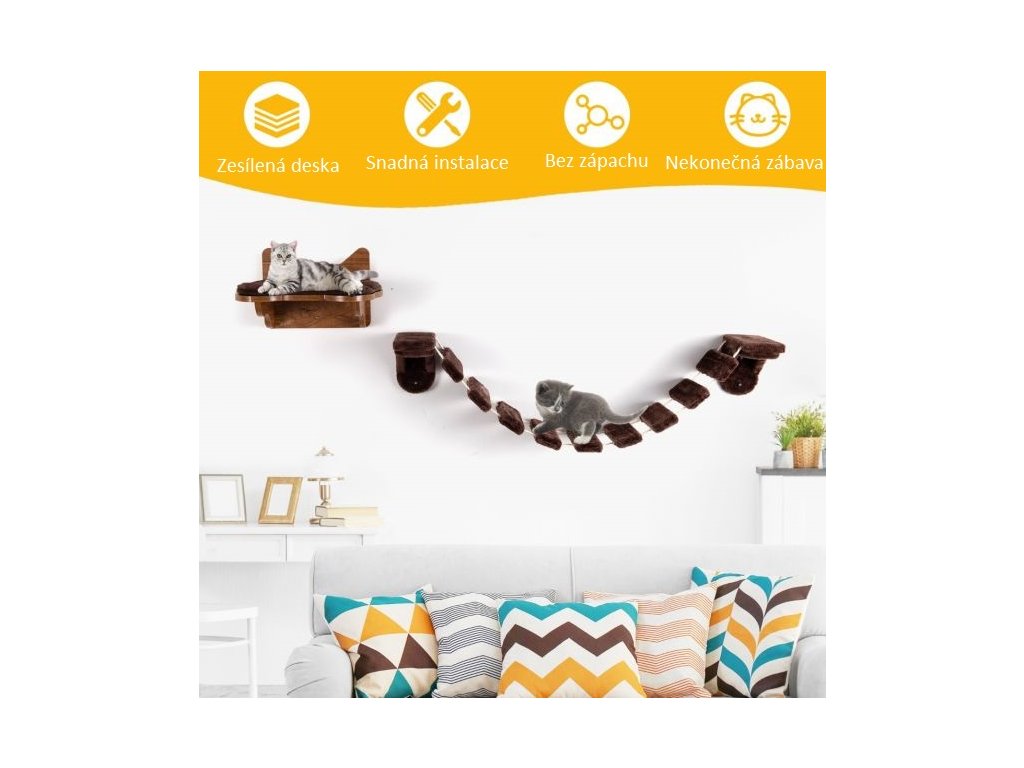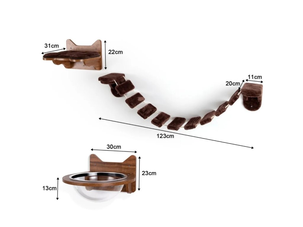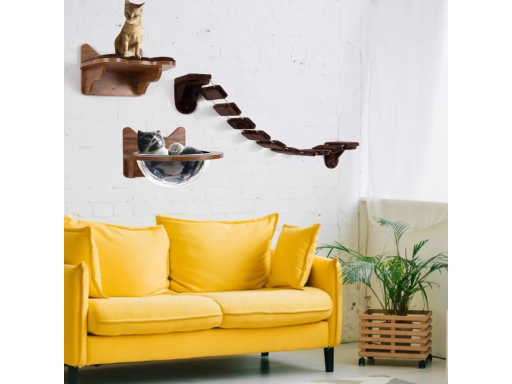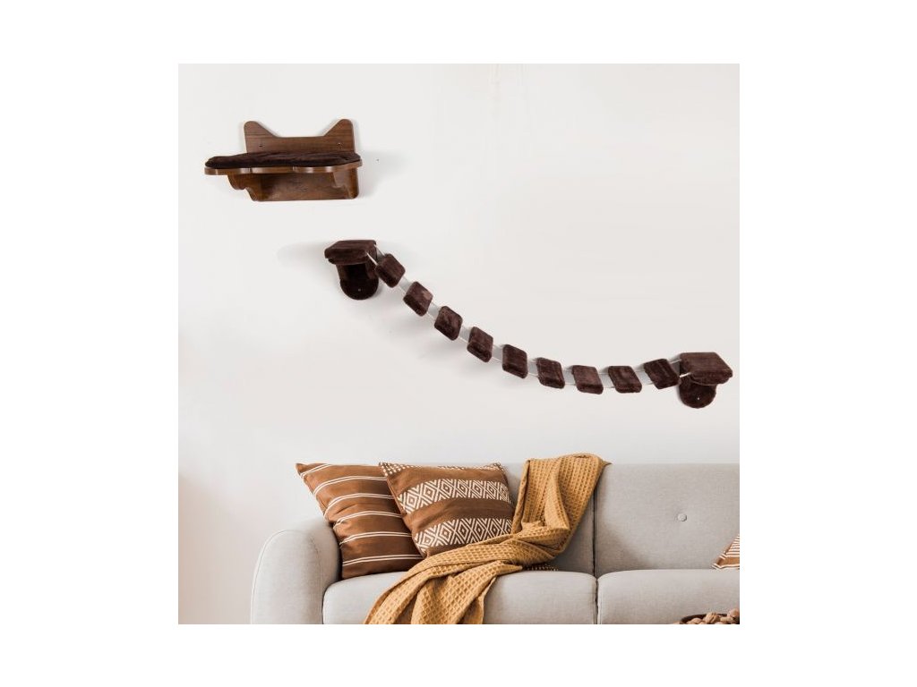 Vytvořte ráj pro svojí kočku s touto lezeckou stěnou, která se skládá ze tří částí, které jsou: nástěnná police, vesmírné lůžko a žebřík s chlupatým povrchem. Vaše kočka najde místo, kde může spálit svou energii nebo si odpočinout. Stěna je prostorově úsporná a velmi snadno se instaluje podle návodu za použití běžného nářadí. Sada nástěnných prolézaček umožnuje vaší kočce lézt nahoru a dolu pro větší zábavu. Vyvýšené místo bude pro vaší kočku ideální k odpočinku a rozhlédnutí. Montáž na stěnu šetří spoustu místa ve vašem domově. Stěna je vyrobena ze zesílené dřevěné desky, což zajištuje vysokou stabilitu a není snadné stěnu zlomit. Stylový a jedinečný design se bude skvěle hodit do vašeho domova. Stěna se skládá ze dvou krabic.