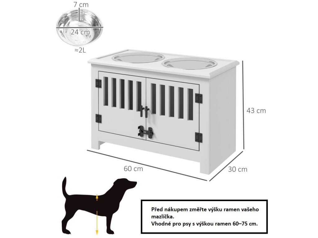 Vyvýšená krmná miska značky PawHut je navržena pro maximální pohodlí velmi velkých psů a podporuje zdravé držení těla při krmení, čímž snižuje zátěž krku a kloubů. Obsahuje dvě vyjímatelné nerezové misky o objemu 2000 ml, které jsou ideální pro podávání krmiva a vody, a jejich snadná vyjímatelnost usnadňuje čištění. Pod miskami se nachází prostorný úložný prostor o objemu 37 litrů s dvířky na západku, kam lze uložit krmivo, pamlsky, hračky či jiné potřeby a udržet tak okolí uklizené. Stabilní konstrukce z MDF a nerezové oceli zajišťuje dlouhou životnost a bezpečné používání, přičemž elegantní bílé provedení se hodí do každého interiéru. Díky nosnosti 20 kg v horní části a 10 kg v úložném prostoru je produkt odolný a praktický, a jeho montáž zvládne jedna osoba během krátké doby.