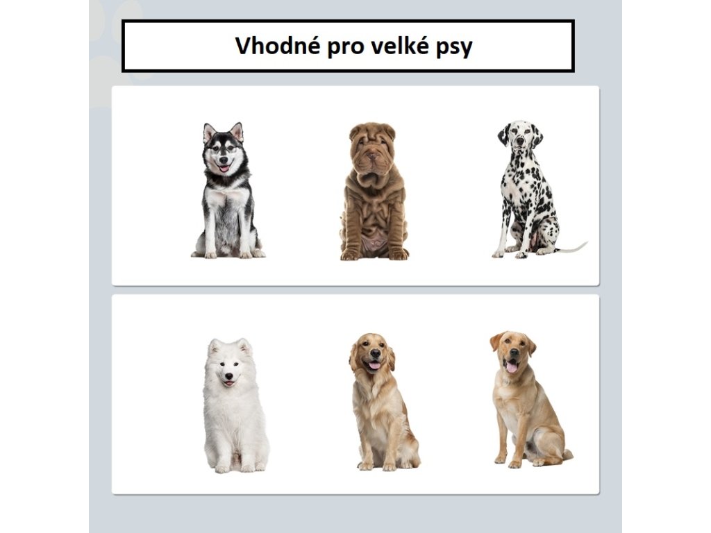 - Vhodné pro velmi velké psy s výškou ramen 60–75 cm