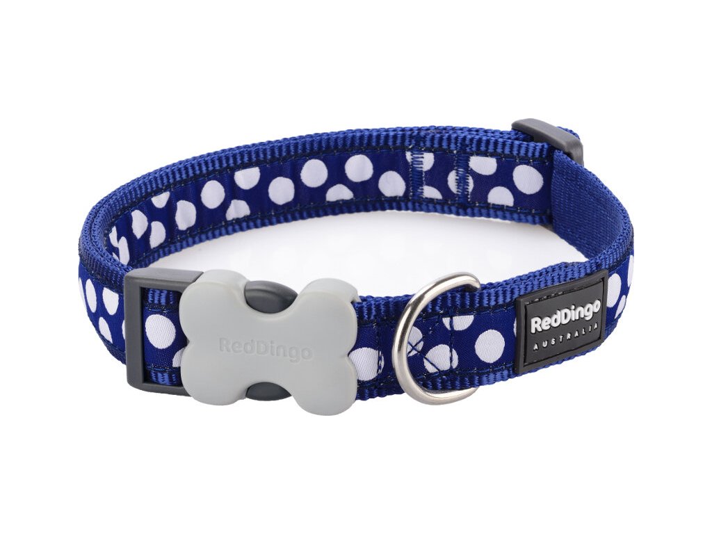 Elegantní, odolný a maximálně pohodlný – Red Dingo obojek s motivem bílých puntíků na tmavě modrém podkladu je ideální volbou pro každého pejska, který si zaslouží styl i bezpečí. Dostupný ve čtyřech velikostech, vhodný pro malá i velká plemena.