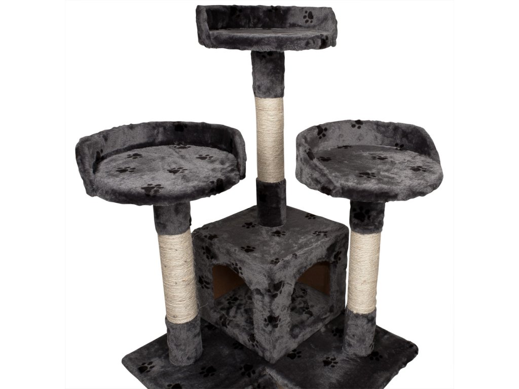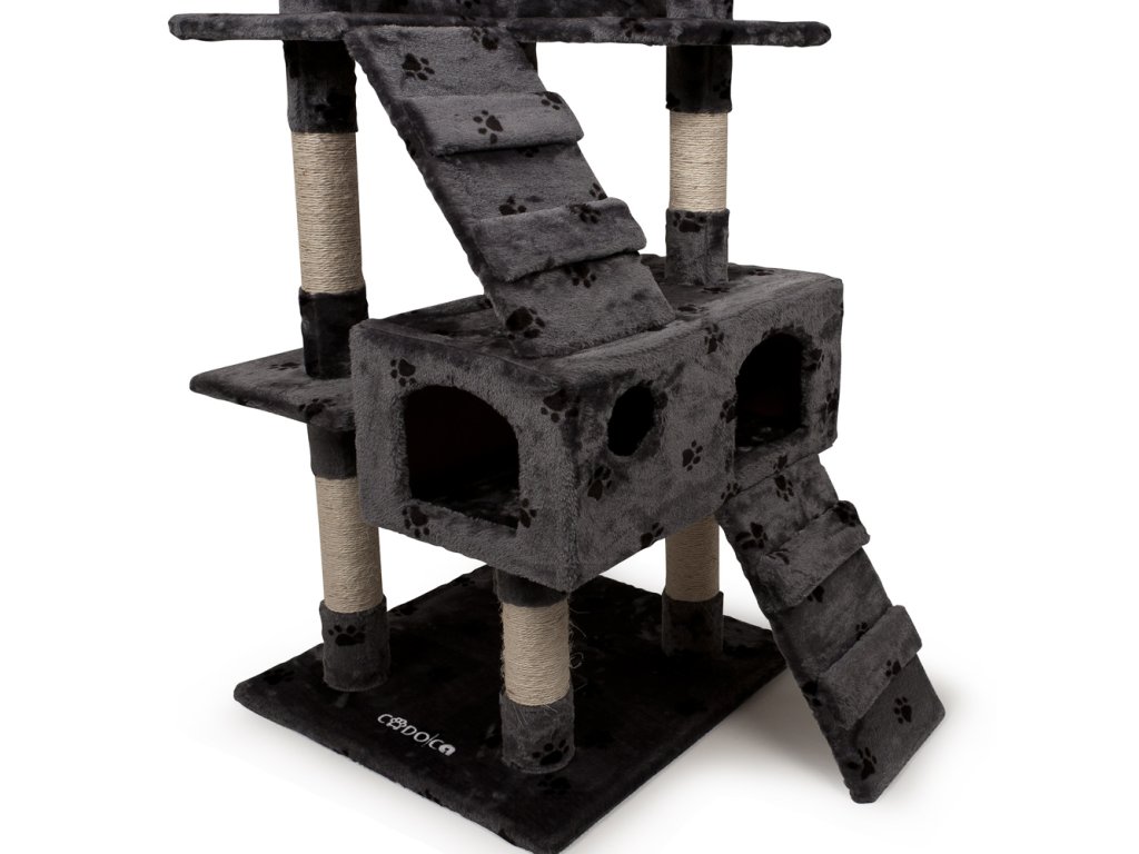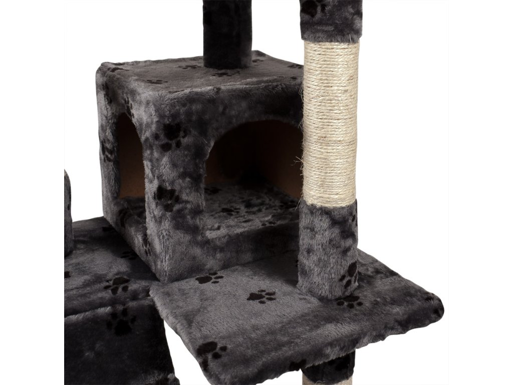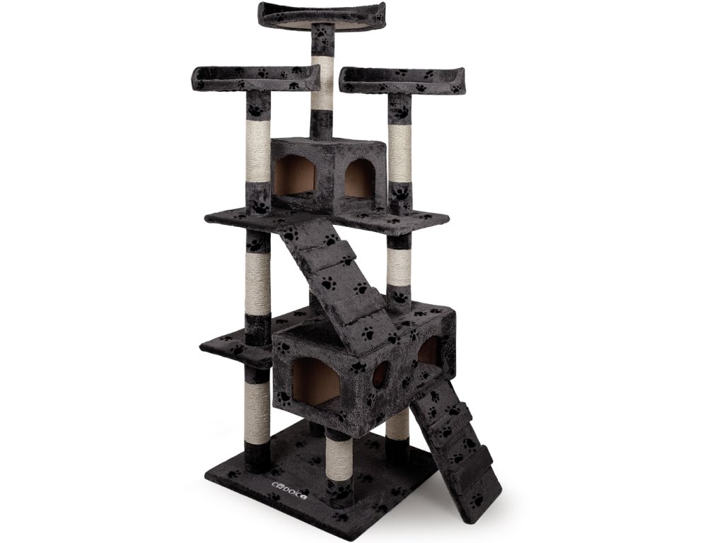 Odpočívadlo a škrabadlo pro kočky se 3 vyhlídkami, 2 domečky, černé s otiskem tlapky, výška 175 cm