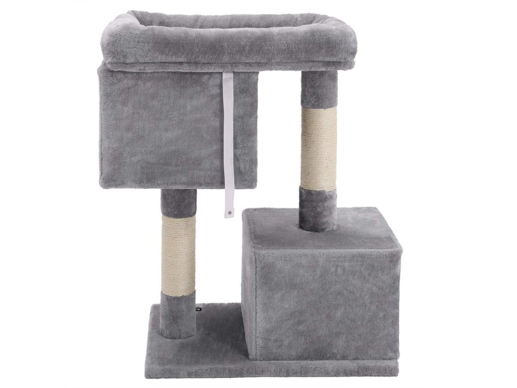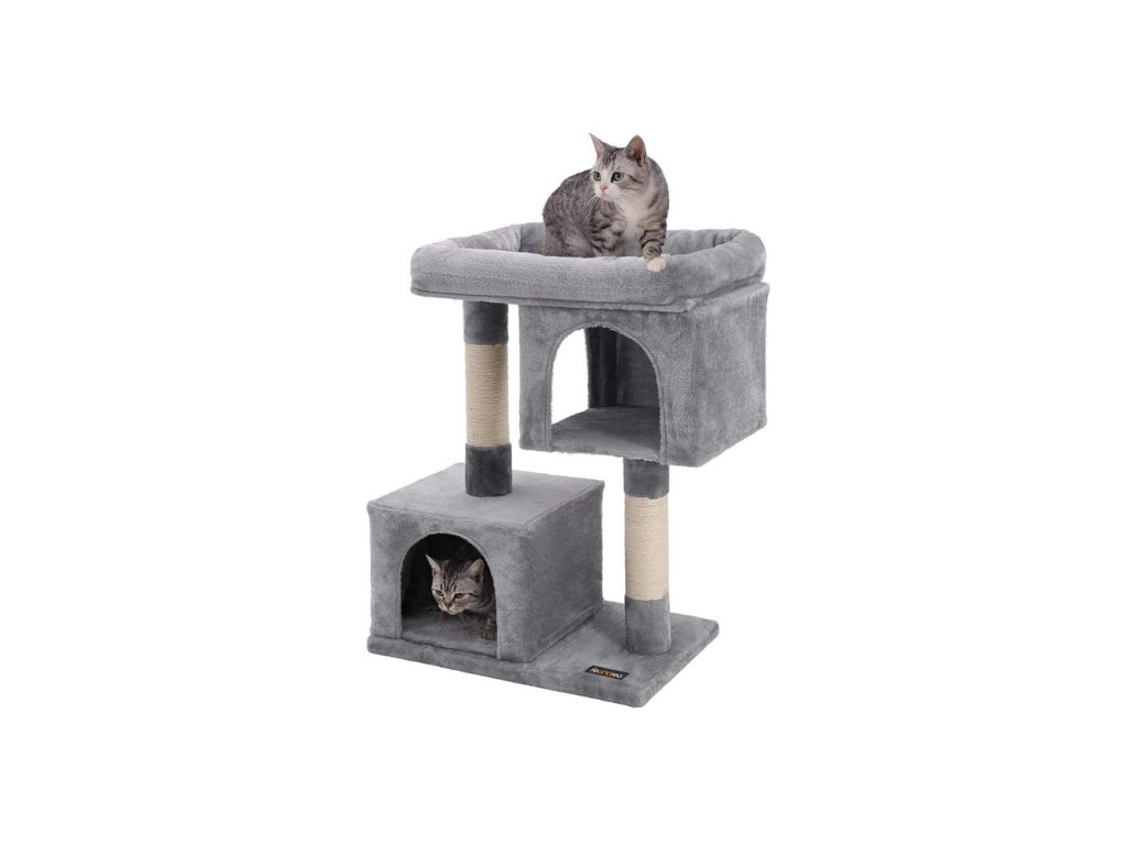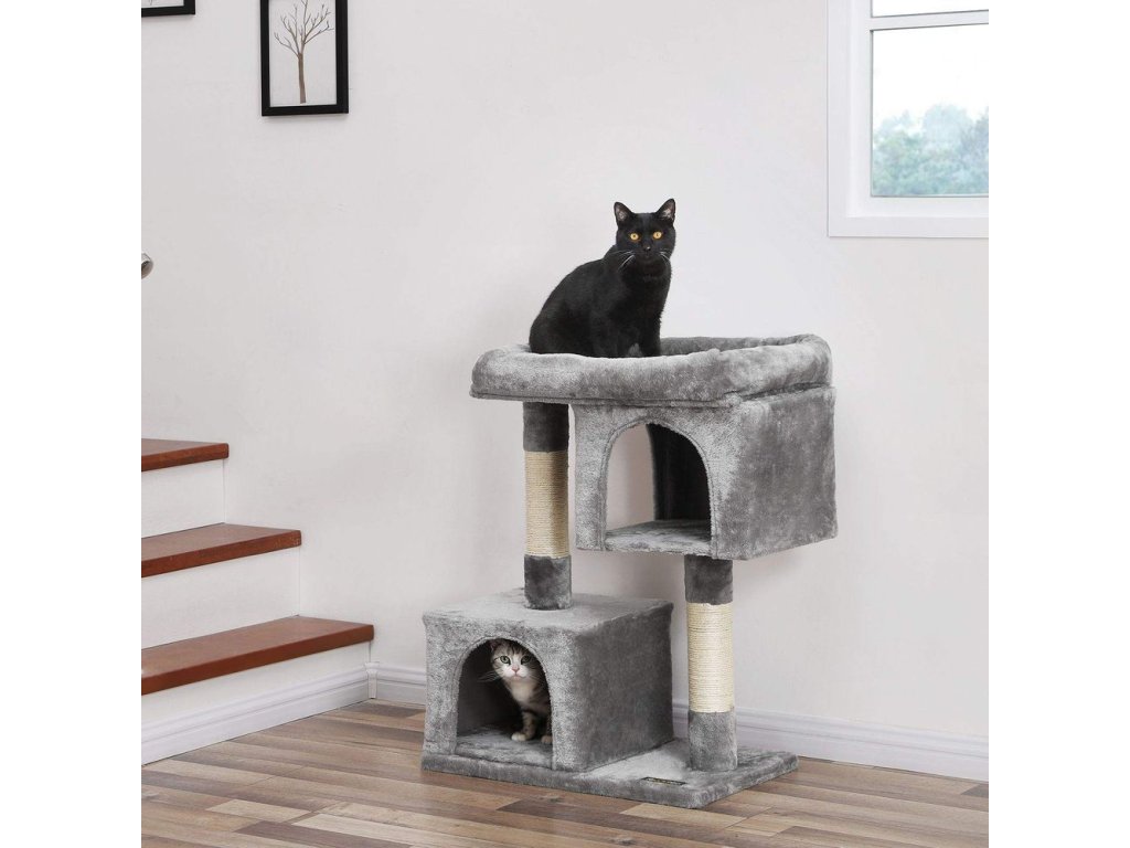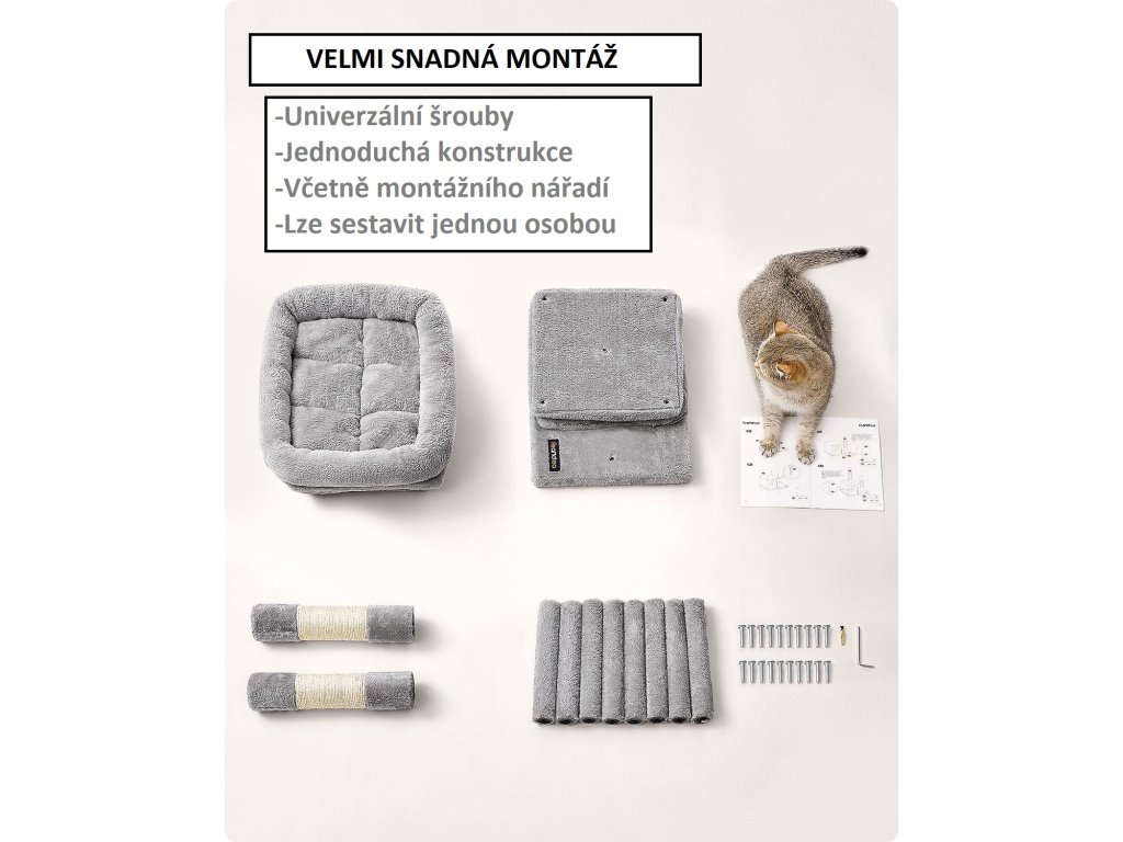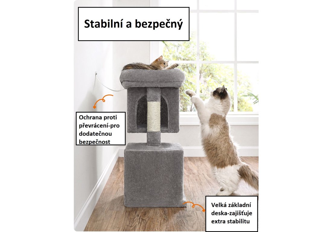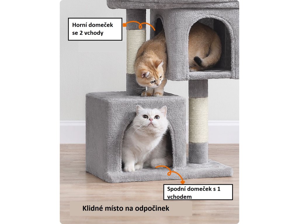 Toto kočičí odpočívadlo je vybaveno velkým pelechem o rozměrech 49 cm x 32 cm s dobře polstrovanými zvýšenými okraji, které nabízí dostatek prostoru, aby se vaše kočka mohla plně rozprostřít a pohodlně relaxovat. Horní jeskyně s dvěma otvory nabízí široký výhled a snadný přístup. Spodní jeskyně je úkrytem pro kočky, které si zde mohou zdřímnout. Spodní jeskyně je také skvělá pro starší kočky, které mají problémy se skákáním, a koťata, která si skákání teprve osvojují. Víceúrovňová konstrukce umožňuje kočkám snadno šplhat nahoru a dolů. Dvě škrabadla splňují přirozené instinkty koček. Horní hrazdička je skvělá pro výhled například z okna. Díky zjednodušené konstrukci můžete tuto věž pro kočky v interiéru postavit sami v několika málo krocích. Robustní dřevotřísková deska pro dlouhodobou životnost, velká základna pro stabilitu a sada proti převrácení pro bezpečnost.