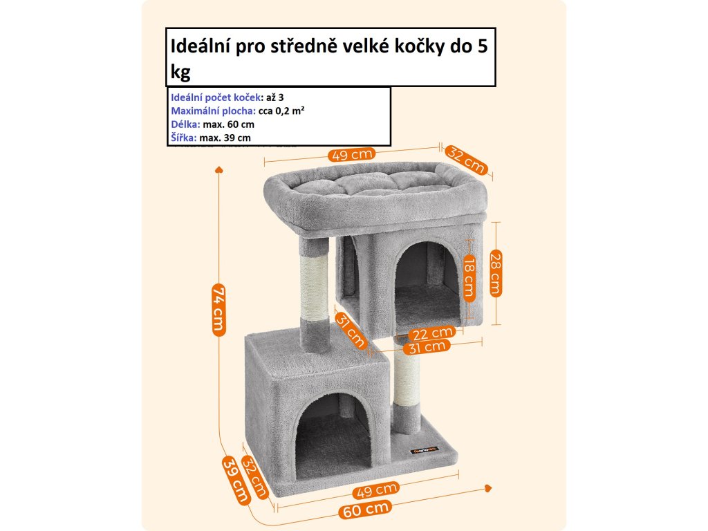 - 74 cm vysoká věž pro kočky, 2 jeskyně