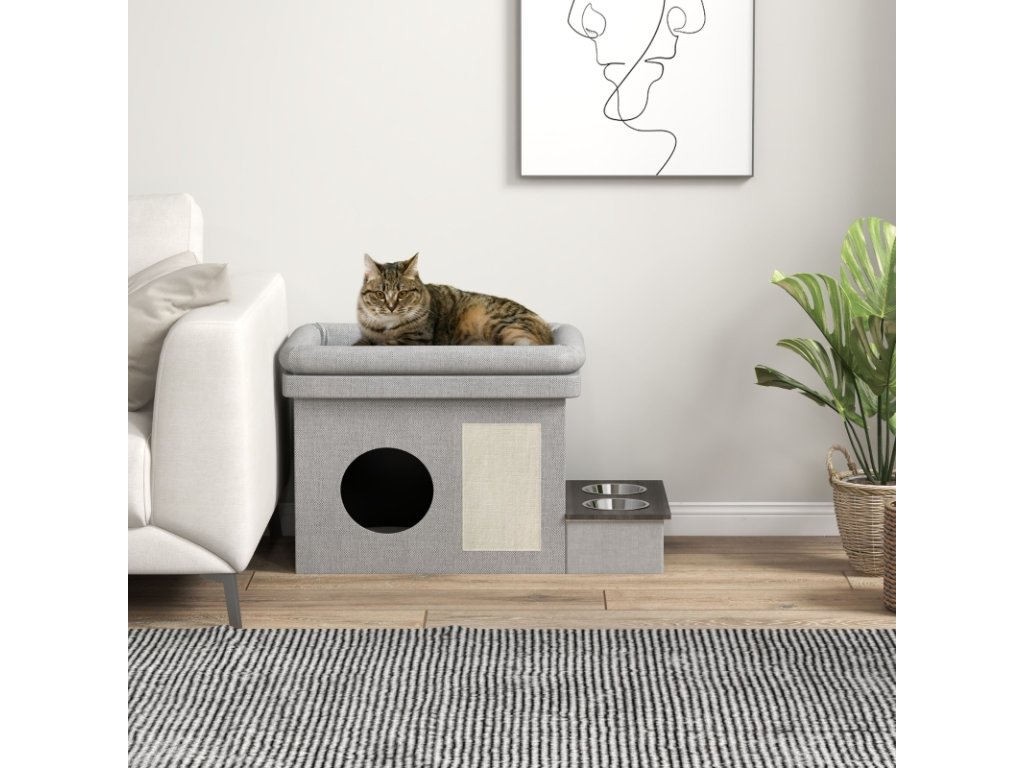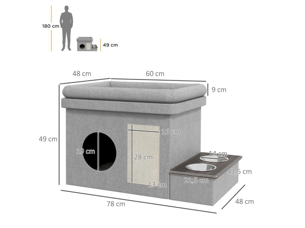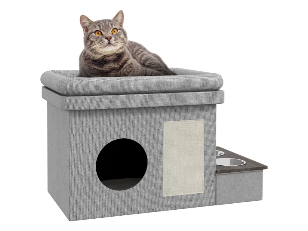 - Bouda pro kočky nebo malé psy s vyvýšeným krmným prostorem obsahuje 2 nerezové misky