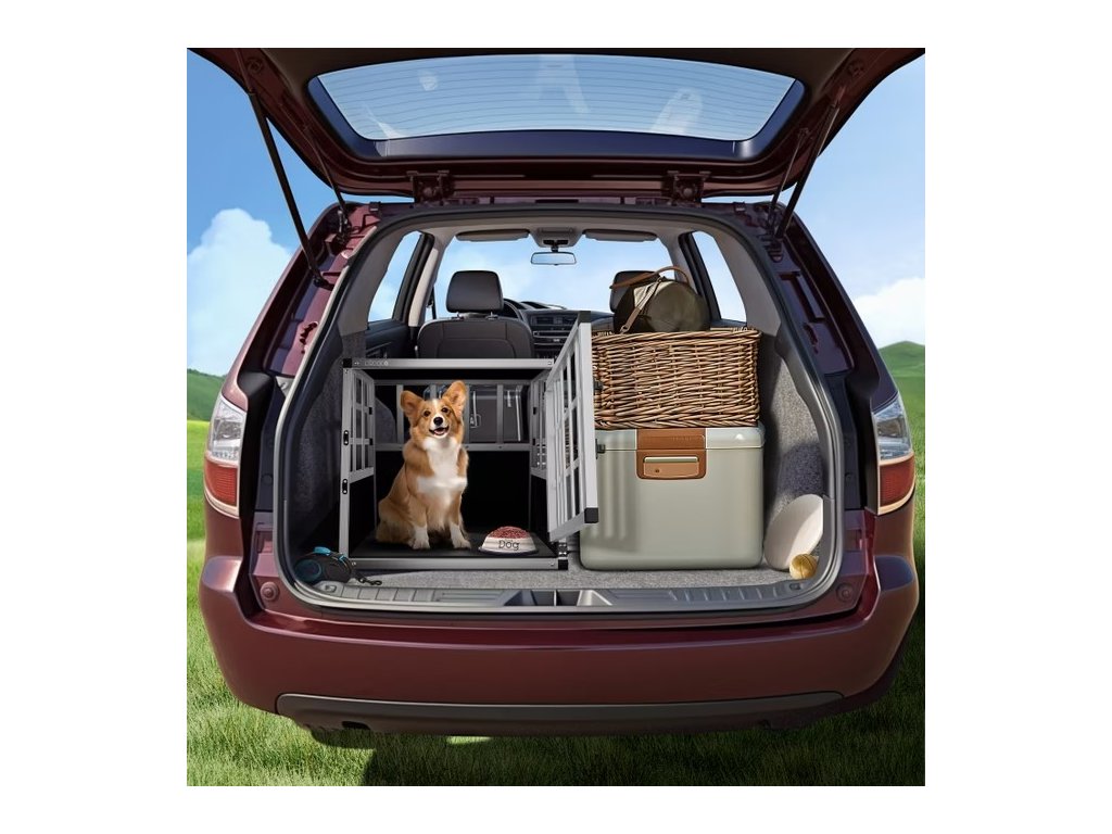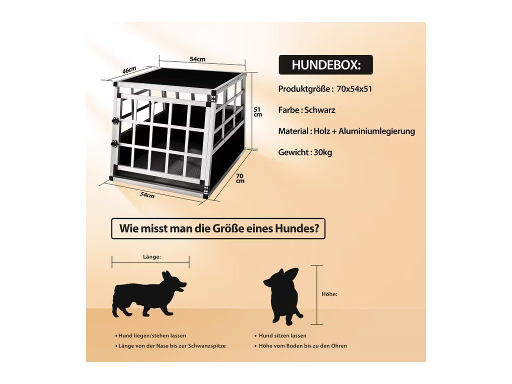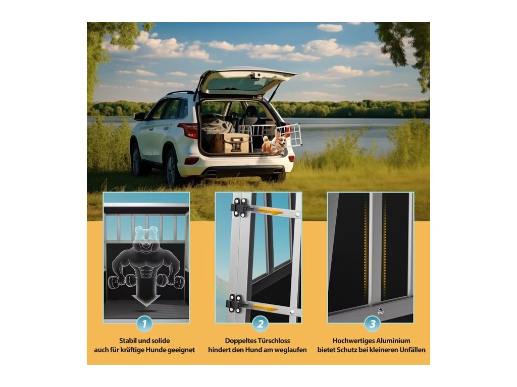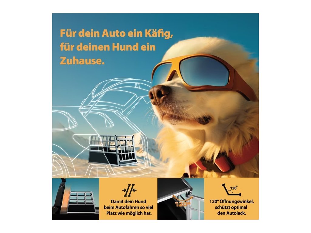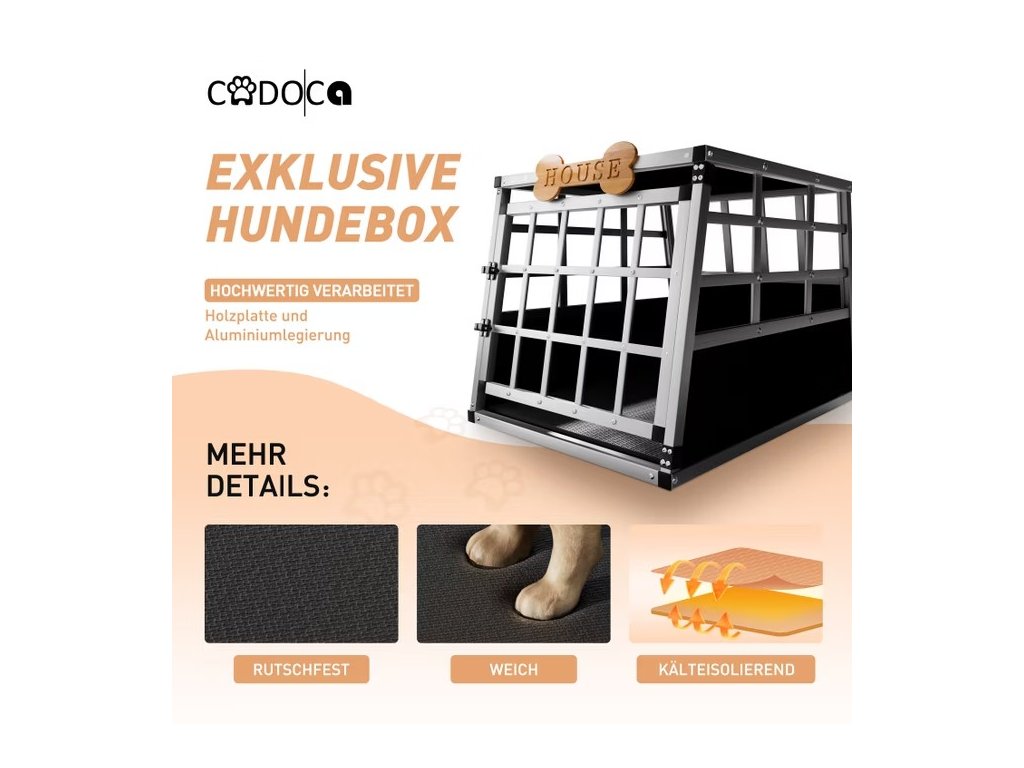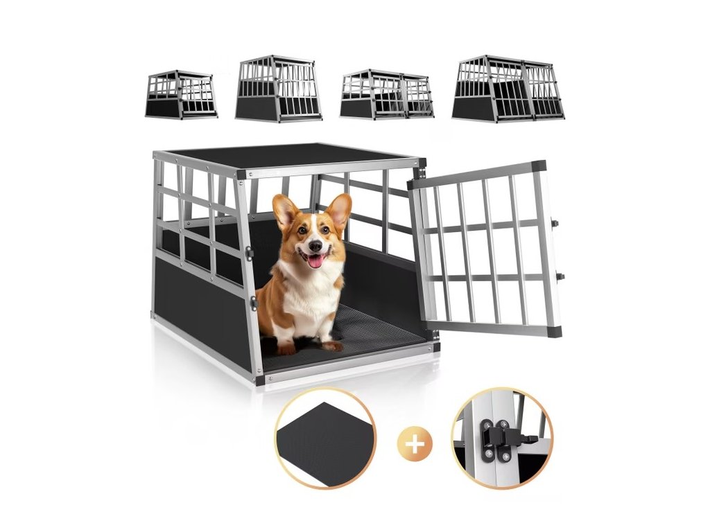 Díky lichoběžníkové konstrukci se přepravní boxy snadno vejdou do všech běžných kombíků. Robustní plastové rohy minimalizují riziko zranění psa nebo při přenášení boxu. Pevně zpracovaný box z hliníku odolného proti vodě a povětrnostním vlivům a MDF se snadno sestavuje a snadno se čistí vlhkým hadříkem. Díky mřížovým vzpěrám váš pes dostane dostatečně čerstvého vzduchu a bude se cítit pohodlně.