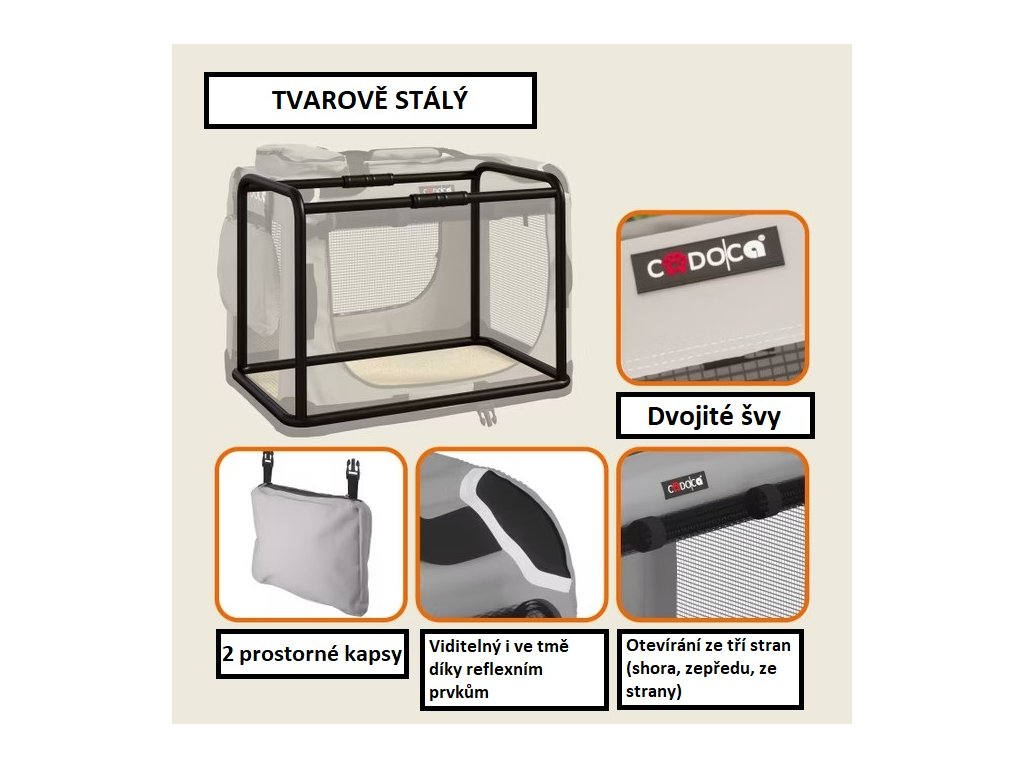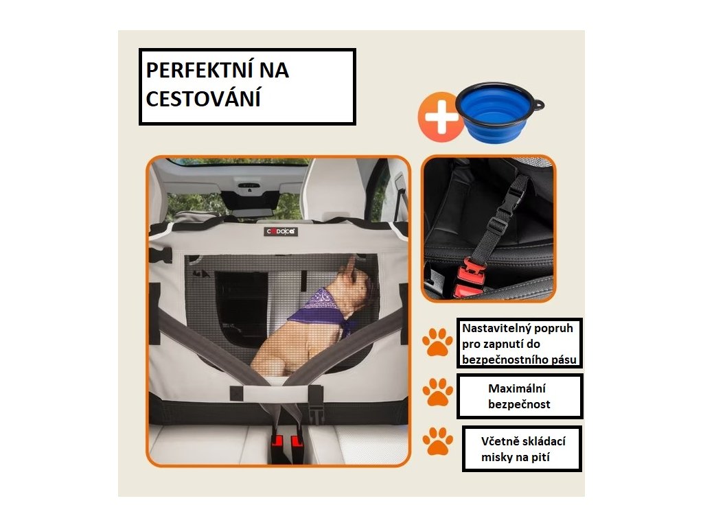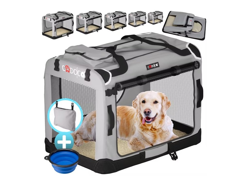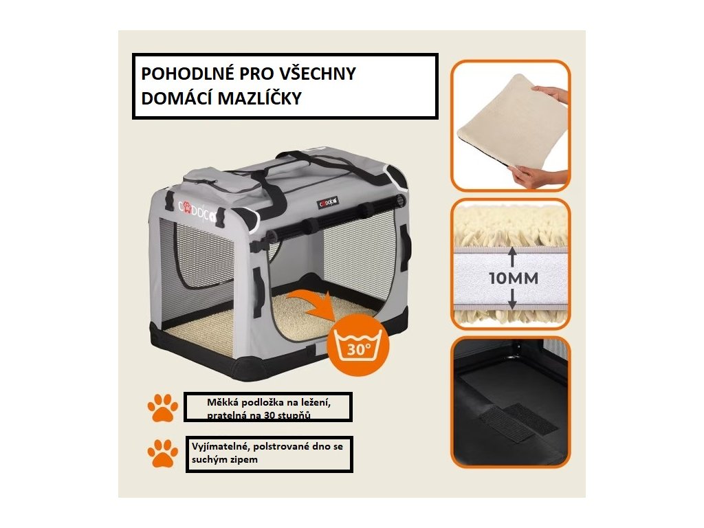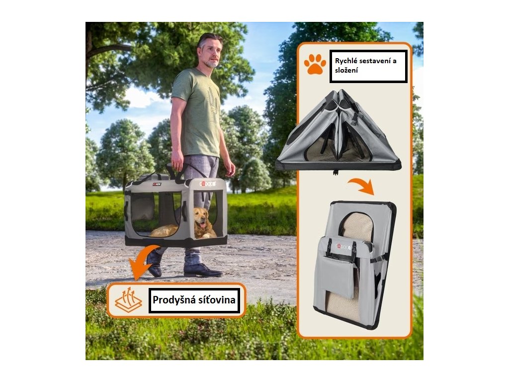 Velké vestavěné síťované přihrádky na všech čtyřech stranách zajišťují dostatečný a příjemný přívod vzduchu. Horní, přední a boční vchody lze otevřít zipem a umožňují rychlý a snadný vstup a výstup. Do dvou prostorných kapes uložíte pamlsky a hračky na výlet k veterináři nebo na dovolenou pro vašeho čtyřnohého kamaráda. Psí box lze rychle sestavit a demontovat díky skládací ocelové konstrukci a lze jej tedy uložit pro úsporu místa.