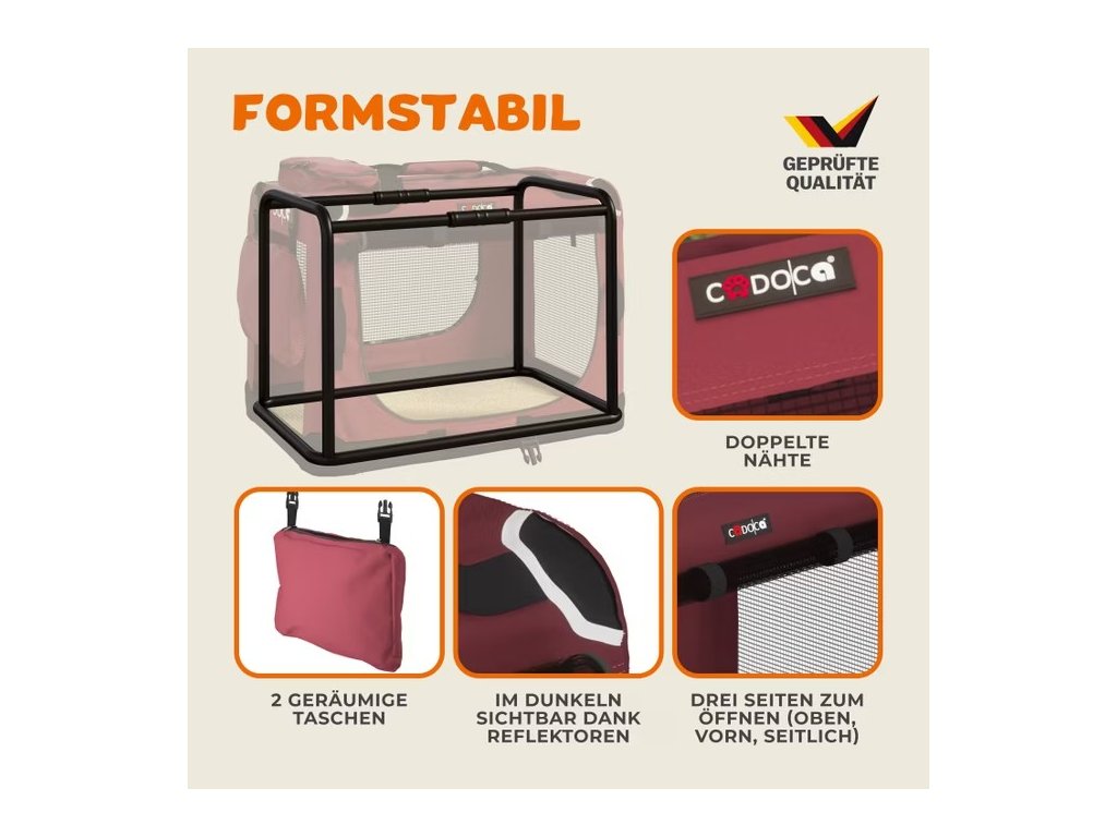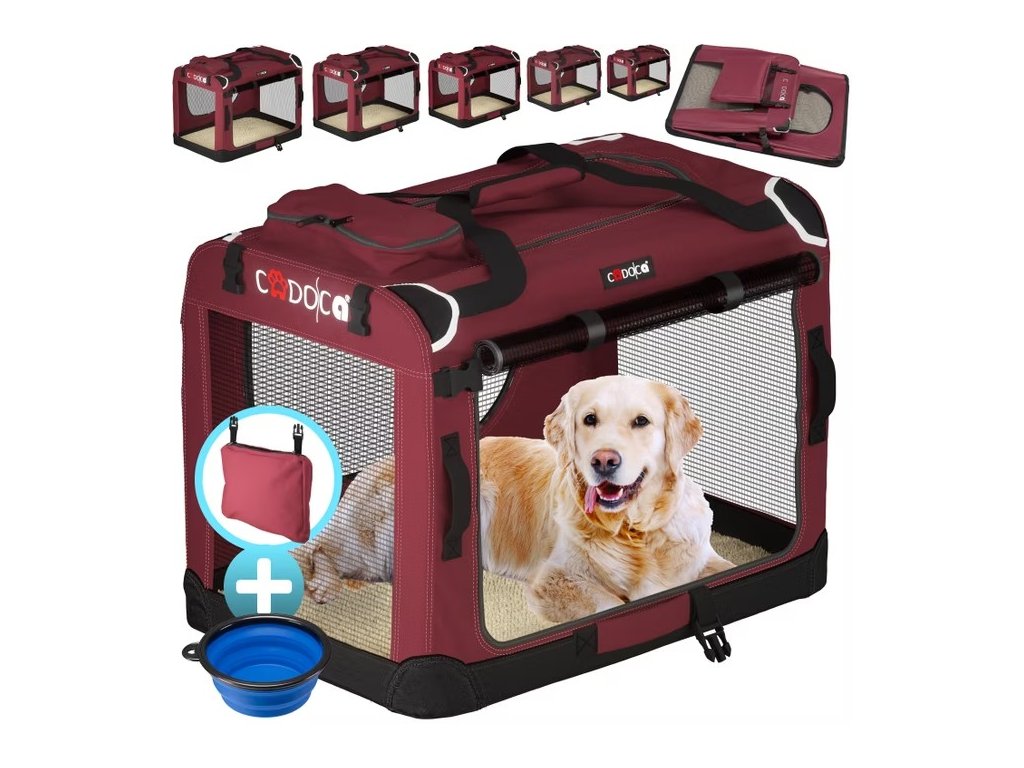 Velké vestavěné síťované přihrádky na všech čtyřech stranách zajišťují dostatečný a příjemný přívod vzduchu. Horní, přední a boční vchody lze otevřít zipem a umožňují rychlý a snadný vstup a výstup. Do dvou prostorných kapes uložíte pamlsky a hračky na výlet k veterináři nebo na dovolenou pro vašeho čtyřnohého kamaráda. Psí box lze rychle sestavit a demontovat díky skládací ocelové konstrukci a lze jej tedy uložit pro úsporu místa.