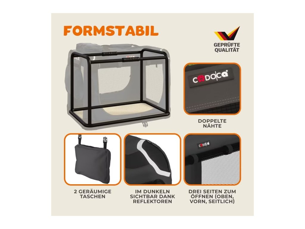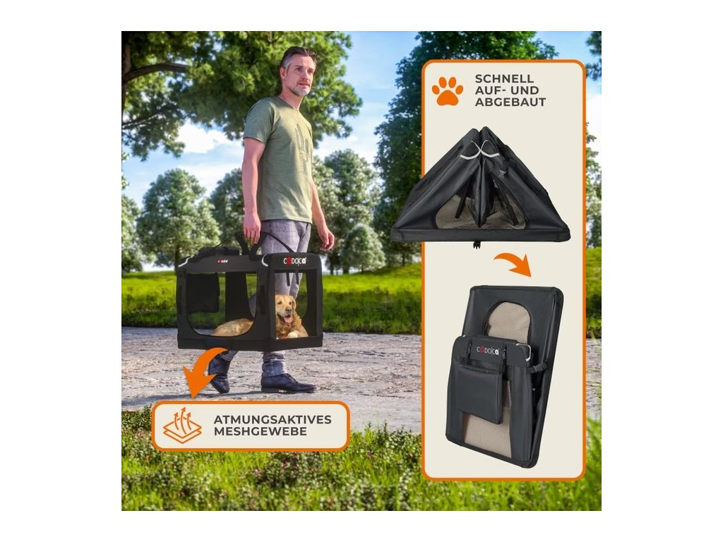 Velké vestavěné síťované přihrádky na všech čtyřech stranách zajišťují dostatečný a příjemný přívod vzduchu. Horní, přední a boční vchody lze otevřít zipem a umožňují rychlý a snadný vstup a výstup. Do dvou prostorných kapes uložíte pamlsky a hračky na výlet k veterináři nebo na dovolenou pro vašeho čtyřnohého kamaráda. Psí box lze rychle sestavit a demontovat díky skládací ocelové konstrukci a lze jej tedy uložit pro úsporu místa.
