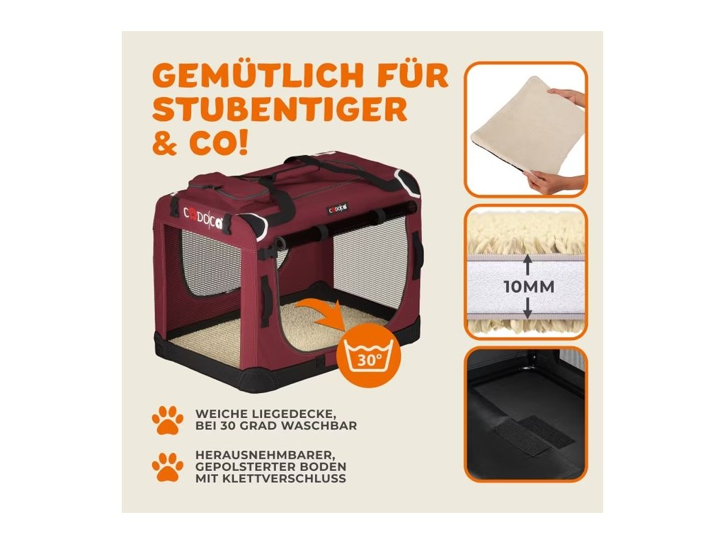 Materiálová tkanina 600D Oxford je odolná a snadno se čistí. Deka se suchým zipem je snímatelná a lze ji prát na 30°C. Díky kvalitnímu materiálu a dobrému zpracování se z boxu budete dlouho těšit vy i váš blízký.