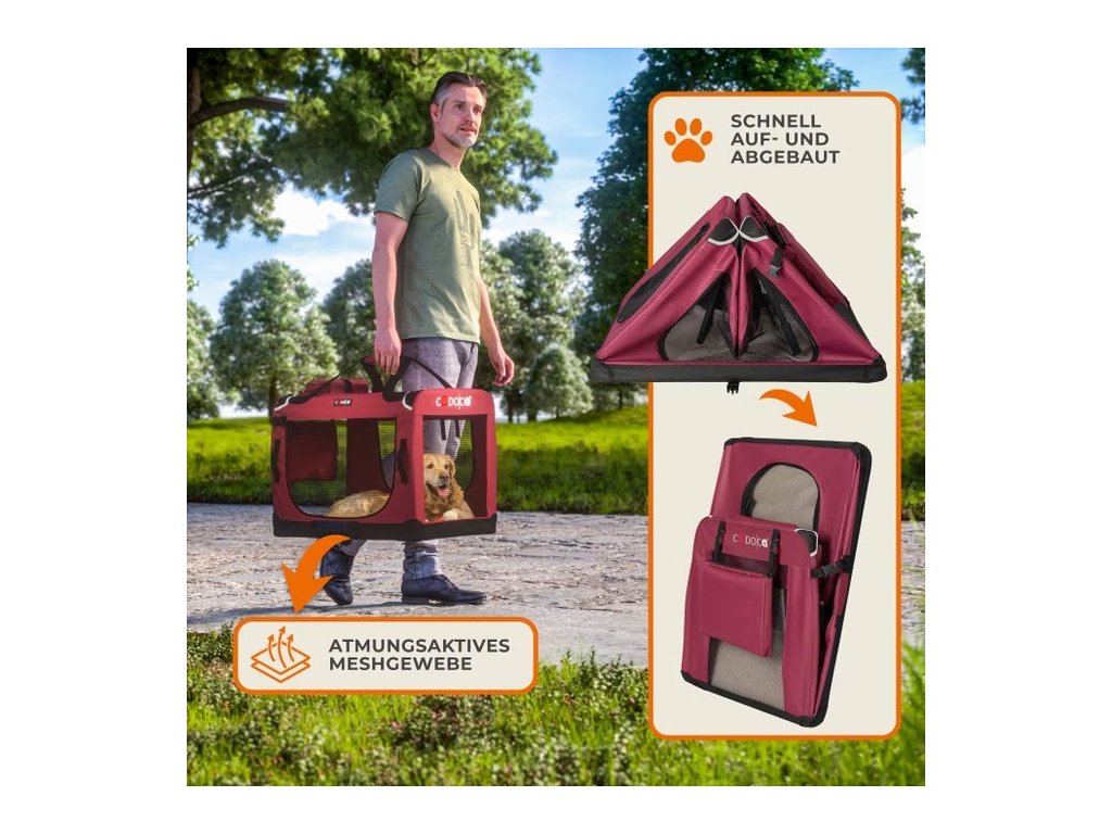 Velké vestavěné síťované přihrádky na všech čtyřech stranách zajišťují dostatečný a příjemný přívod vzduchu. Horní, přední a boční vchody lze otevřít zipem a umožňují rychlý a snadný vstup a výstup. Do dvou prostorných kapes uložíte pamlsky a hračky na výlet k veterináři nebo na dovolenou pro vašeho čtyřnohého kamaráda. Psí box lze rychle sestavit a demontovat díky skládací ocelové konstrukci a lze jej tedy uložit pro úsporu místa.