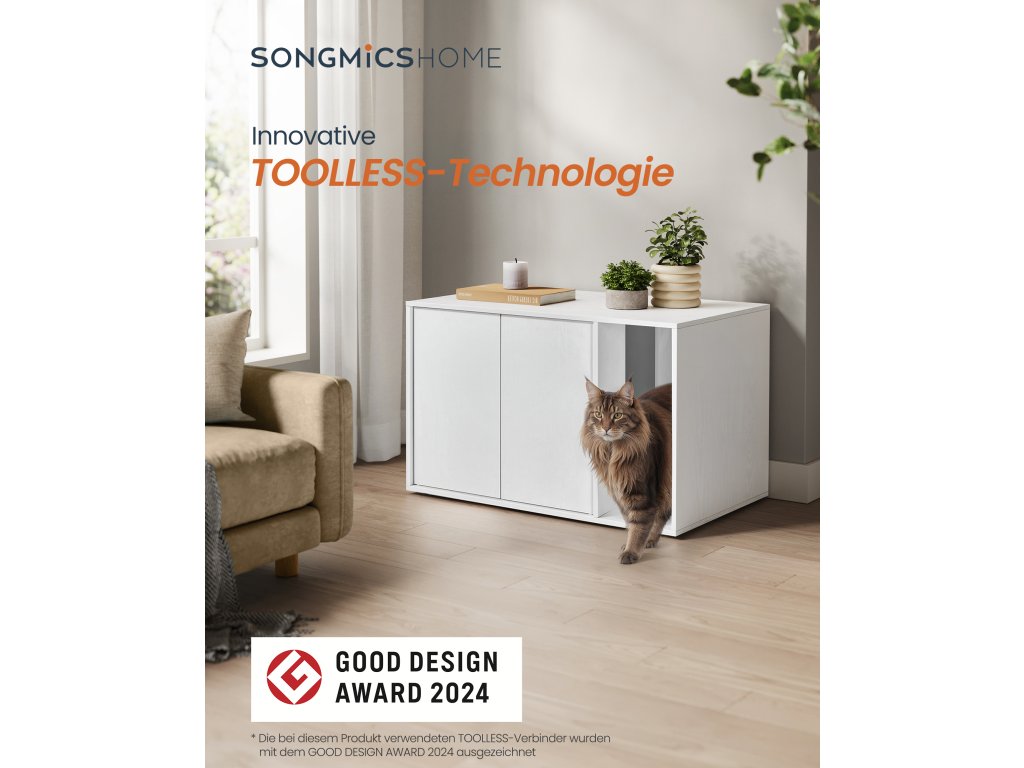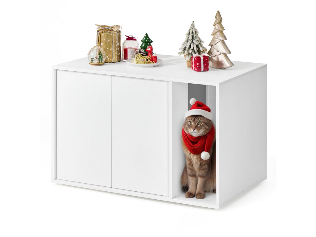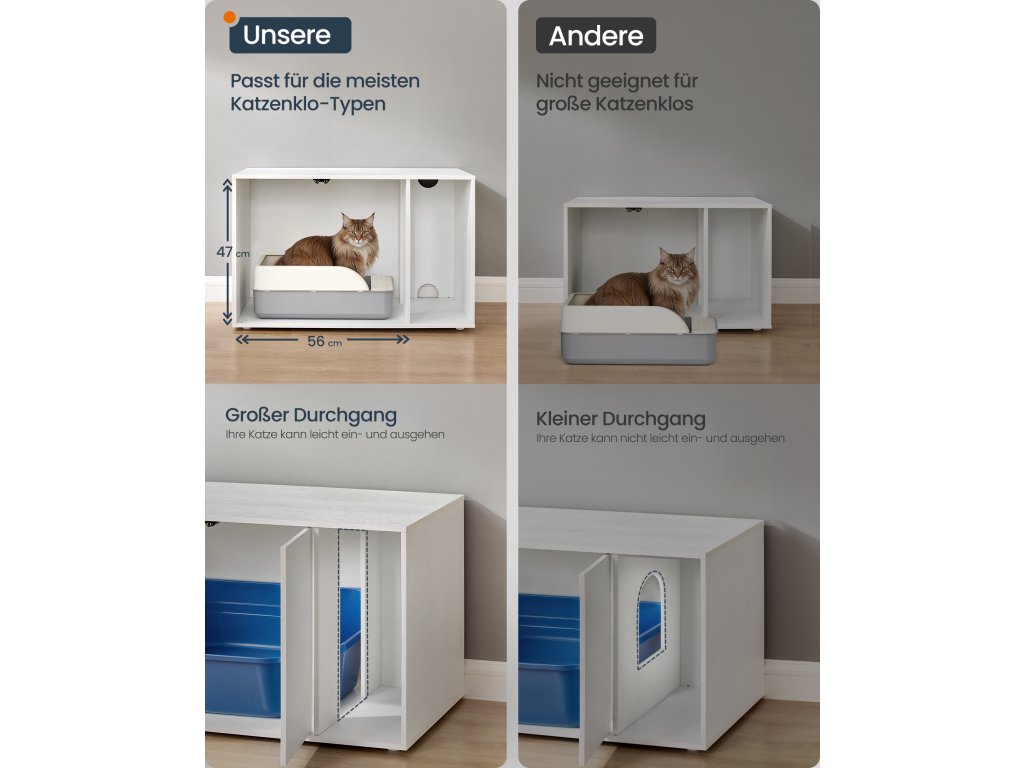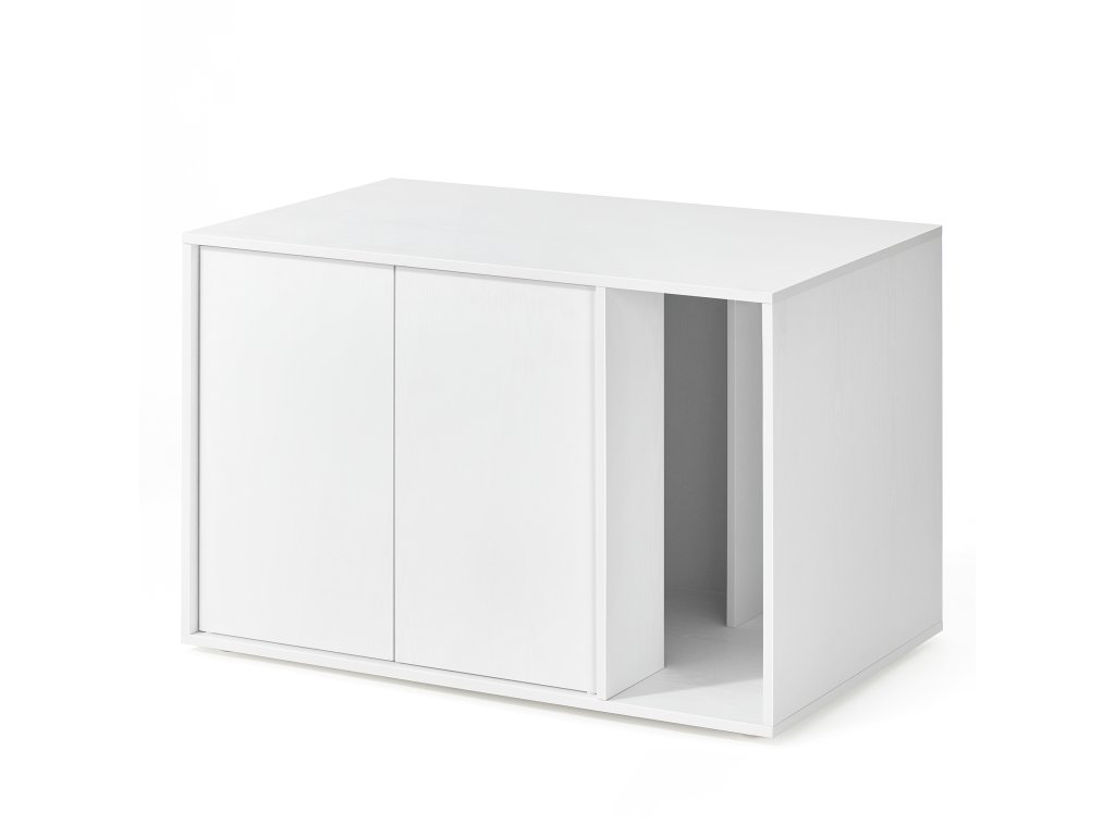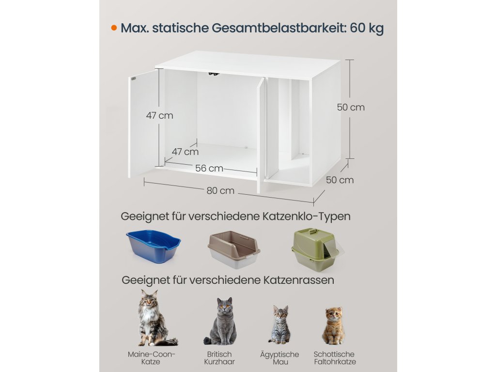 Tento moderní kryt na kočičí toaletu nabízí kombinaci stylového minimalistického designu a praktického využití. Prostorný vnitřek o rozměrech 56 × 47 × 47 cm poskytuje dostatek místa i pro velké kočky a většinu běžných toalet. Rychlá montáž bez použití nářadí díky zacvakávacím spojům vám ušetří čas a starosti. Nábytek zároveň zajišťuje kočce soukromí, snižuje šíření zápachu a omezí roznášení steliva. Pevná konstrukce z kvalitní dřevotřísky unese až 60 kg a skvěle zapadne do jakéhokoli interiéru.