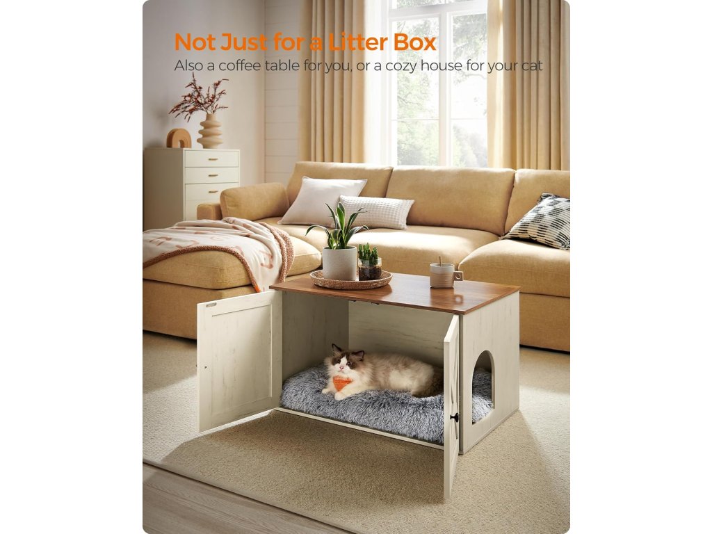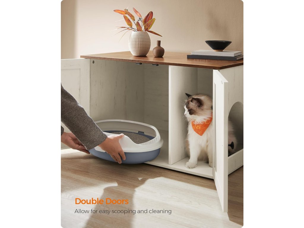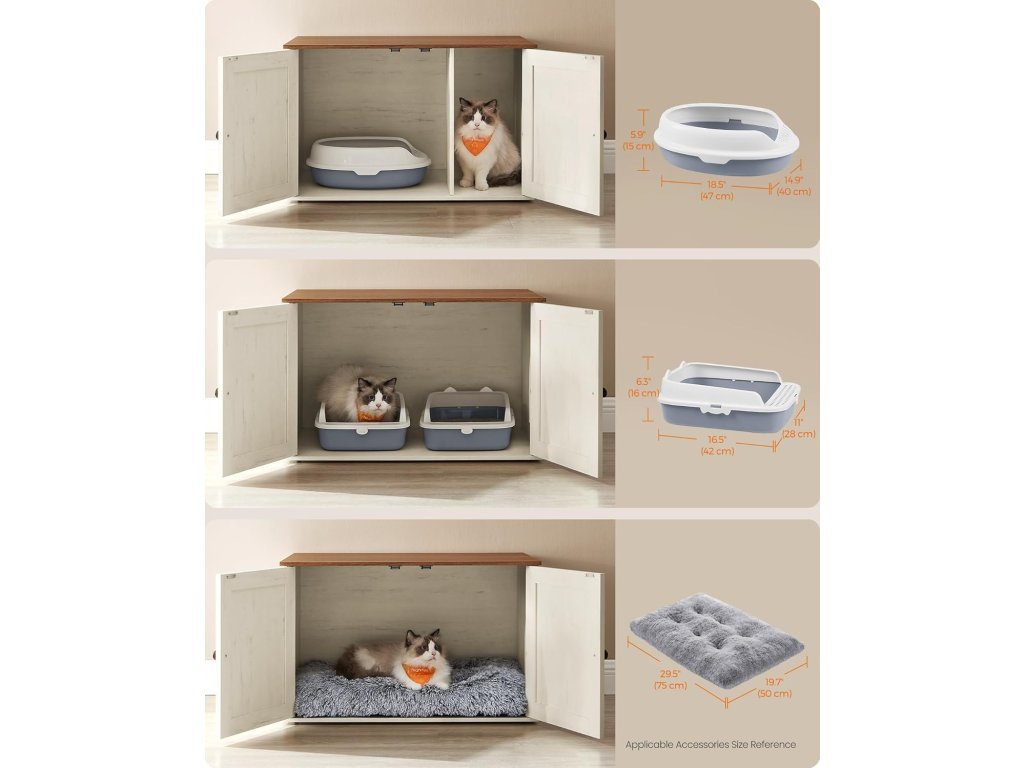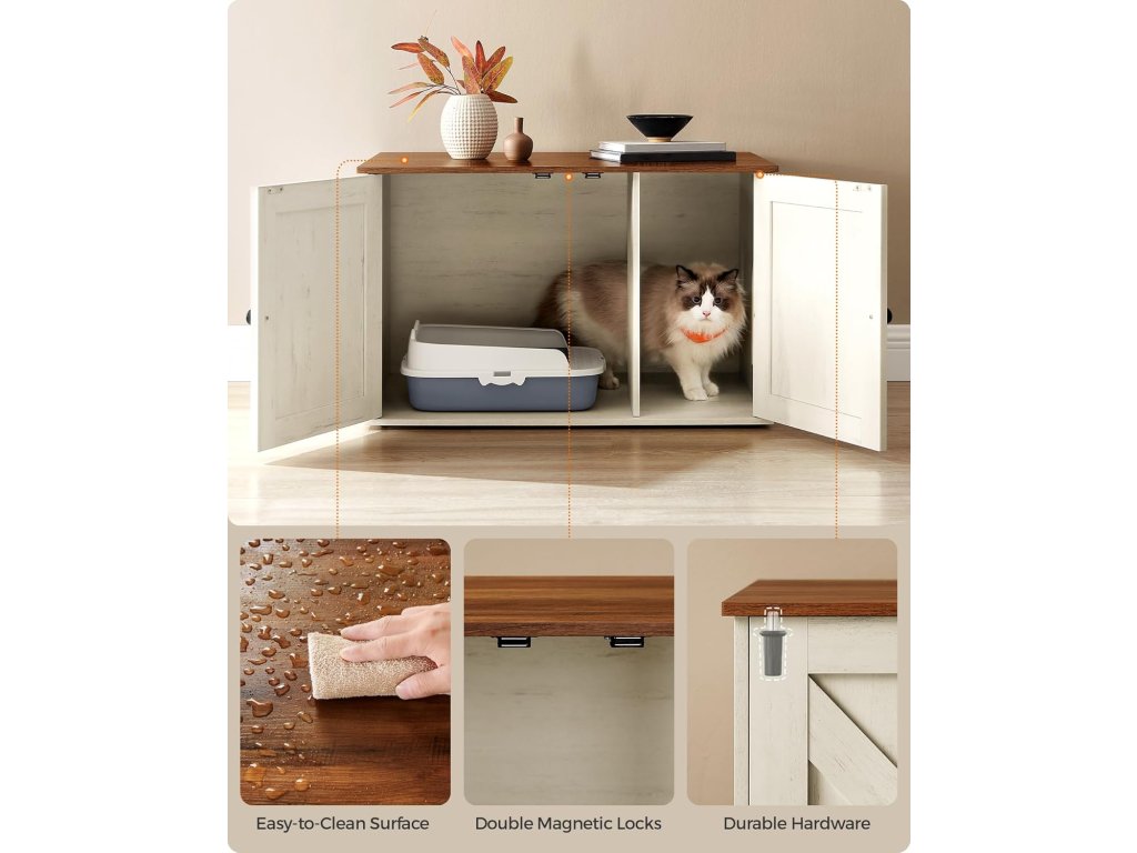 Stylová skříňka v kombinaci hnědé a rustikálně bílé barvy chytře ukryje kočičí toaletu a dodá interiéru elegantní vzhled. Uzavřený prostor zajistí kočce soukromí a pomáhá omezit zápach i nepořádek. Vnitřní část lze přizpůsobit – s přepážkou pro běžné záchody nebo bez přepážky pro větší prostor. Pevná konstrukce z MDF a dřevotřísky unese až 60 kg na horní desce (s přepážkou). Skříňku lze využít také jako pelíšek, odkládací stolek nebo dekorativní prvek.
