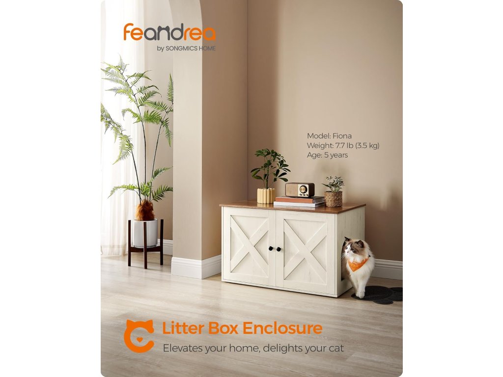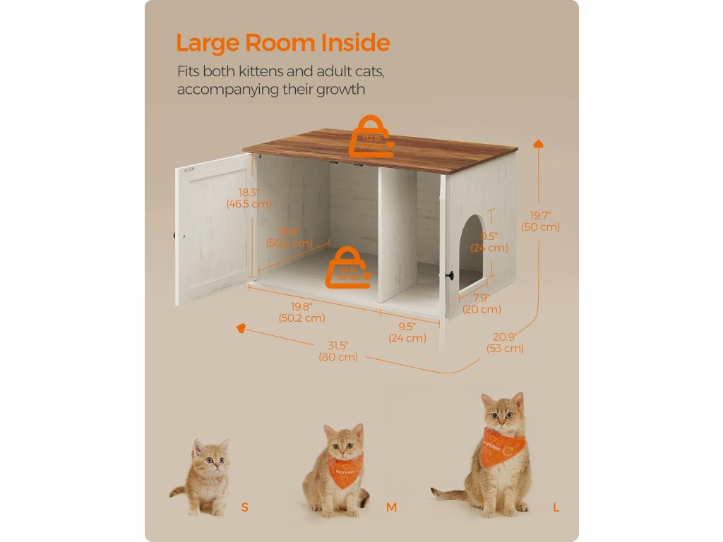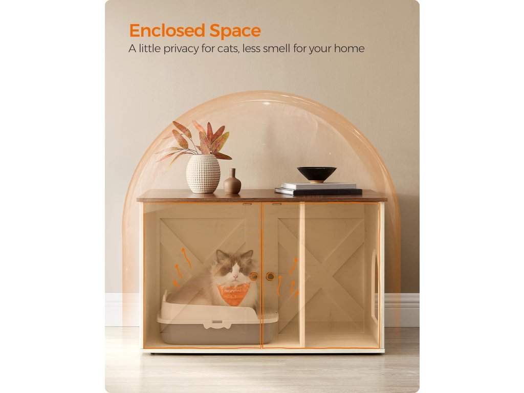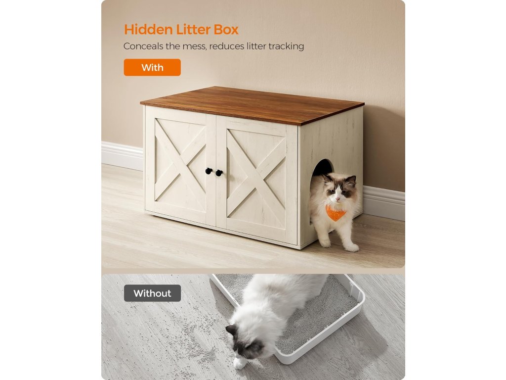 Stylová skříňka v kombinaci hnědé a rustikálně bílé barvy chytře ukryje kočičí toaletu a dodá interiéru elegantní vzhled. Uzavřený prostor zajistí kočce soukromí a pomáhá omezit zápach i nepořádek. Vnitřní část lze přizpůsobit – s přepážkou pro běžné záchody nebo bez přepážky pro větší prostor. Pevná konstrukce z MDF a dřevotřísky unese až 60 kg na horní desce (s přepážkou). Skříňku lze využít také jako pelíšek, odkládací stolek nebo dekorativní prvek.
