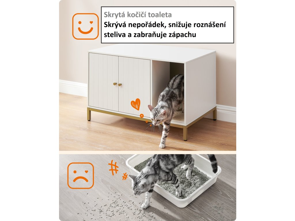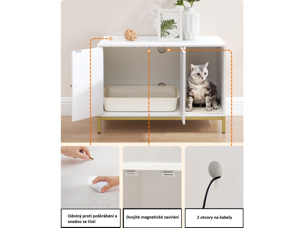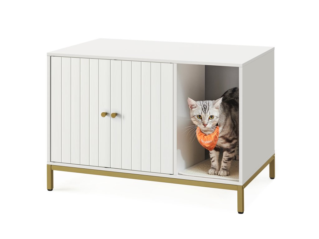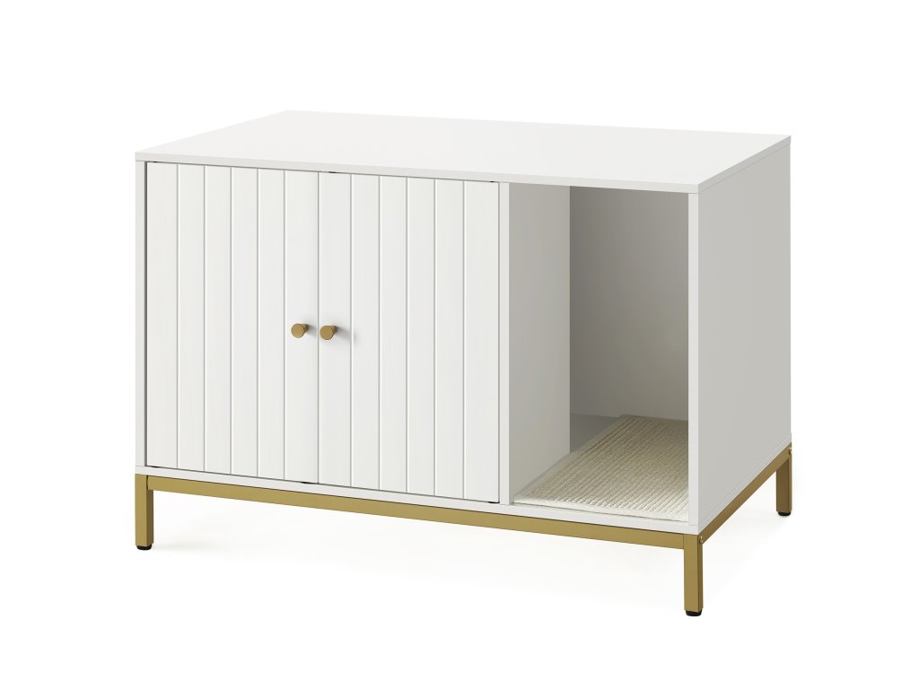 Stylová skříňka na kočičí toaletu v bílé barvě se zlatým kovovým rámem elegantně zapadne do každého interiéru. Vnitřní prostor o rozměrech 52 × 50 × 41,9 cm pojme většinu běžných kočičích toalet, přičemž přední vstup umožňuje flexibilní umístění. Díky dvířkům se snadno čistí a zvýšené nohy usnadní úklid pod skříňkou.