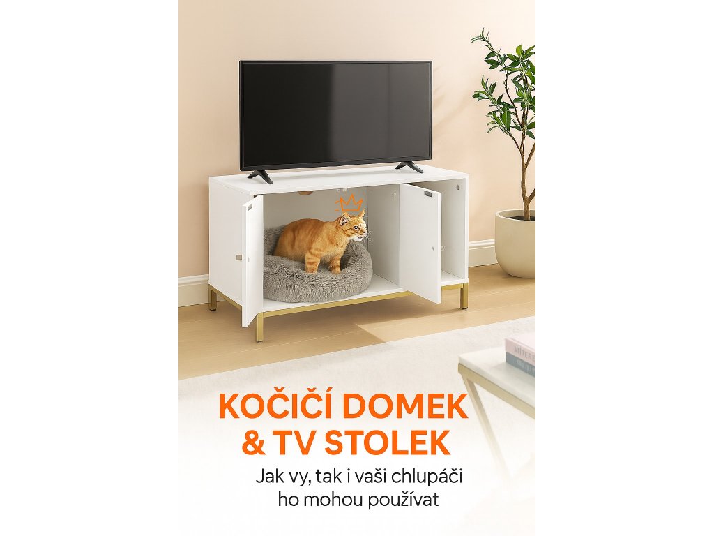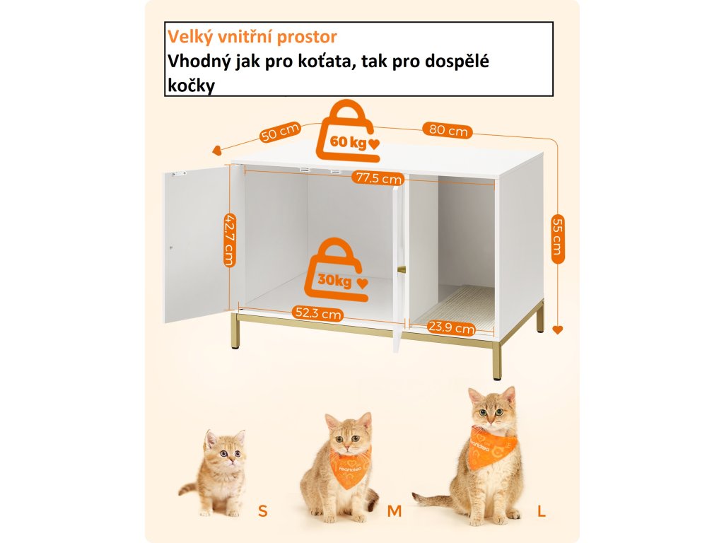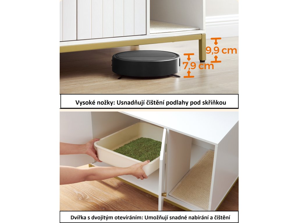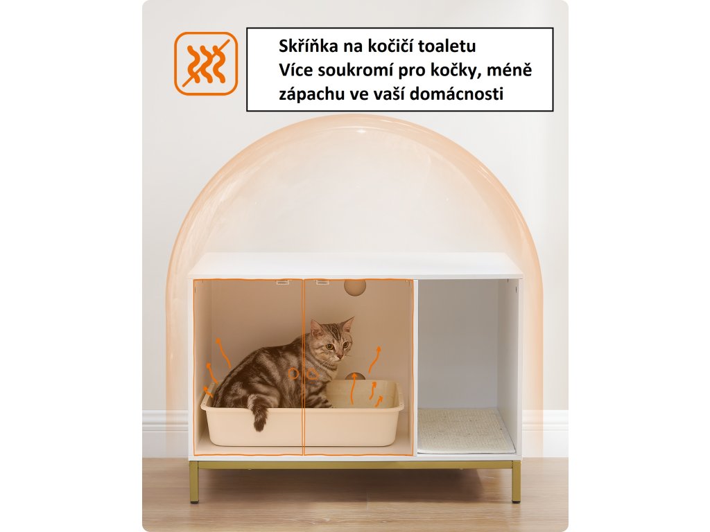 Stylová skříňka na kočičí toaletu v bílé barvě se zlatým kovovým rámem elegantně zapadne do každého interiéru. Vnitřní prostor o rozměrech 52 × 50 × 41,9 cm pojme většinu běžných kočičích toalet, přičemž přední vstup umožňuje flexibilní umístění. Díky dvířkům se snadno čistí a zvýšené nohy usnadní úklid pod skříňkou.
