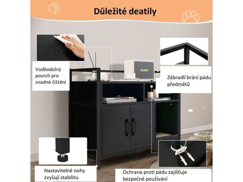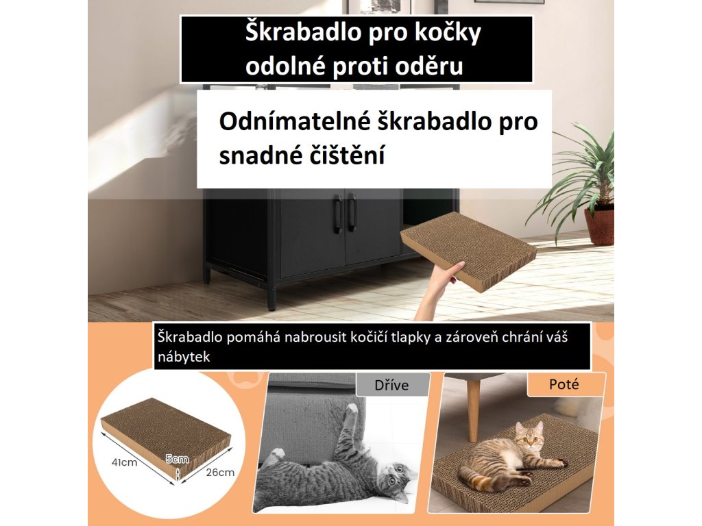 Nechte své domácí mazlíčky spokojeně šplhat nahoru a dolů s naší skříňkou pro domácí mazlíčky! Ať už potřebujete skrytý box na stelivo nebo úložnou skříňku, naše velká přepravka pro kočky bude chytrá volba. Tato skříňka je vybavena větracími otvory a dvojitými dvířky, které zajišťují větrání a soukromí, takže je ideálním místem pro ukrytí kočičího steliva. Vedle skříňky je snadný přístup k přihrádce pro umístění kočičího škrabadla. Silná podložka na kočičí škrabadlo vydrží časté škrábání ostrými drápky vašeho milovaného mazlíčka, a chrání tak váš nábytek. Prostorná deska a 2 přihrádky poskytují dostatek prostoru pro uložení některých vašich každodenních potřeb. Proto je naše skříňka na stelivo ideální úložnou skříňkou do předsíně nebo skříňkou do obývacího pokoje. Díky zesílenému kovovému rámu, nastavitelným nožkám a zařízení proti převrácení navíc náš domeček pro kočky dobře plní funkci bezpečnosti i stability.